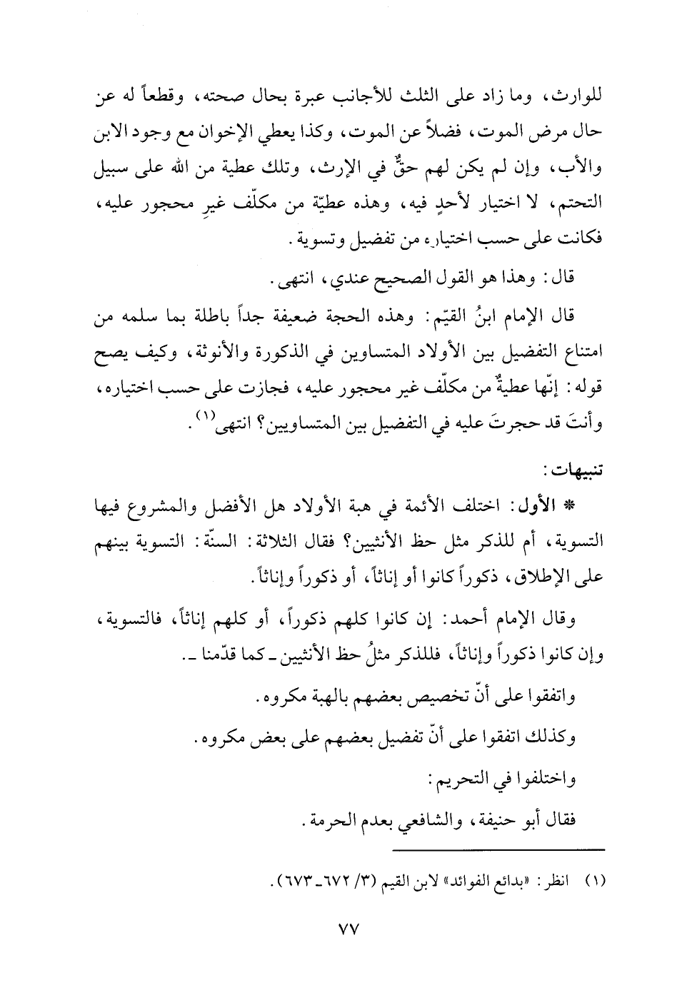 قال الإمام ابنُ القيّم: وهذه الحجة ضعيفة جدًا باطلة بما سلمه من امتناع التفضيل بين الأولاد المتساوين في الذكورة والأنوثة، وكيف يصح قوله: إنّها عطيةٌ من مكلّف غير محجور عليه، فجازت على حسب اختياره، وأنتَ قد حجرتَ عليه في التفضيل بين المتساويين، انتهى (١).