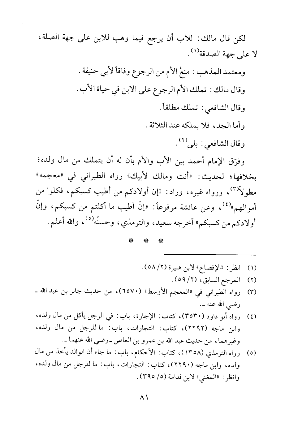 (٥) رواه الترمذي (١٣٥٨)، كتاب: الأحكام، باب: ما جاء أن الوالد يأخذ من مال ولده، وابن ماجة (٢٢٩٠)، كتاب: التجارات، باب: ما للرجل من مال ولده، انظر: "المغني" لابن قدامة (٥/ ٣٩٥).