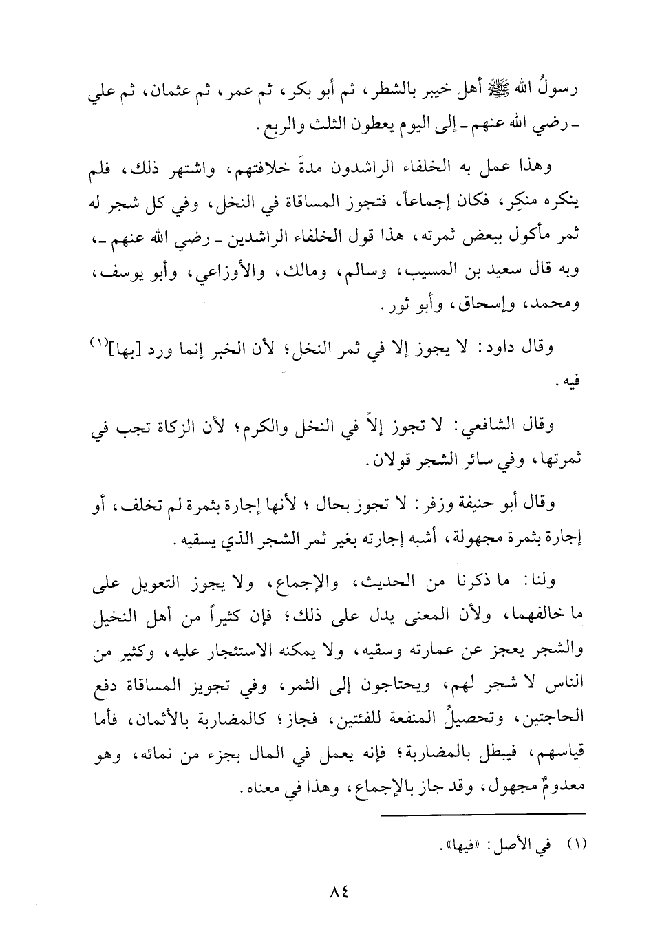 وهذا عمل به الخلفاء الراشدون مدةَ خلافتهم، واشتهر ذلك، فلم ينكره منكِر، فكان إجماعًا، فتجوز المساقاة في النخل، وفي كل شجر له ثمر مأكول ببعض ثمرته، هذا قول الخلفاء الراشدين - رضي الله عنهم -، وبه قال سعيد بن المسيب، وسالم، ومالك، والأوزاعي، وأبو يوسف، ومحمد، وإسحاق، وأبو ثور.