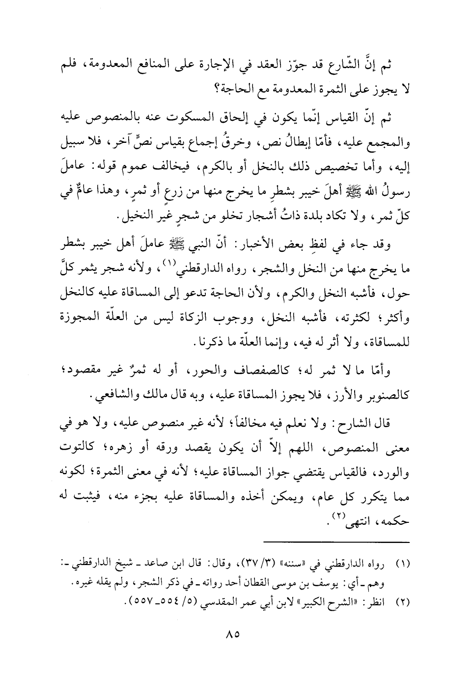 ثم إنّ القياس إنّما يكون في إلحاق المسكوت عنه بالمنصوص عليه والمجمع عليه، فأمّا إبطالُ نص، وخرقُ إجماع بقياس نصٍّ آخر، فلا سبيل إليه، وأما تخصيص ذلك بالنخل أو بالكرم، فيخالف عموم قوله: عاملَ رسولُ الله - صلى الله عليه وسلم - أهلَ خيبر بشطرِ ما يخرج منها من زرعٍ أو ثمرٍ، وهذا عامٌّ في كلّ ثمر، ولا تكاد بلدة ذاتُ أشجار تخلو من شجرٍ غير النخيل.