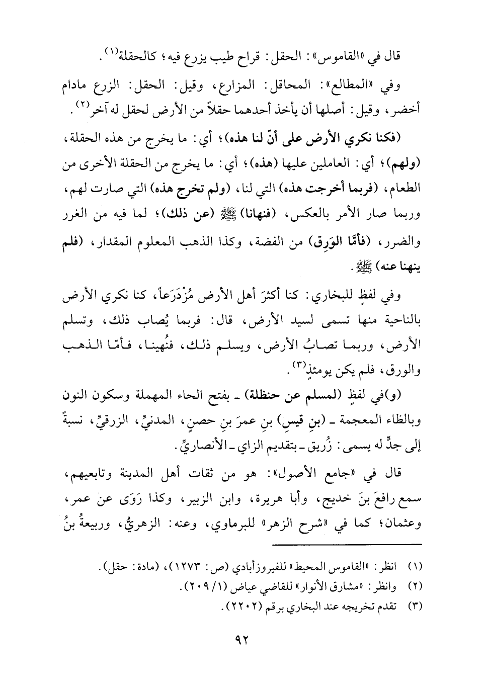 وفي لفظٍ للبخاري: كنا أكثرَ أهل الأرض مُزْدَرَعًا، كنا نكري الأرض بالناحية منها تسمى لسيد الأرض، قال: فربما يُصاب ذلك، وتسلم الأرض، وربما تصابُ الأرض، ويسلم ذلك، فنُهينا، فأمّا الذهب والورق، فلم يكن يومئذٍ (٣).