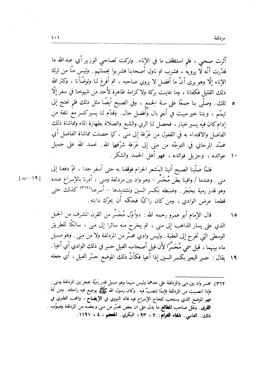 فلما صلينا الصبح أتينا المشعر الحرام فوقفنا به حتى أسفر جدا، ثم دفعنا إلى منى، وعندما وافينا بطن محسر، وهو واد بين مزدلفة ومنى، أمرنا بالإسراع عنده وهو قدر رمية بحجر وضبطه بكسر السين وتشديدها، أسرعنا، كذلك حتى قطعنا عرض الوادي، ومن كان راكبا فحكمه أن يحرك دابته.