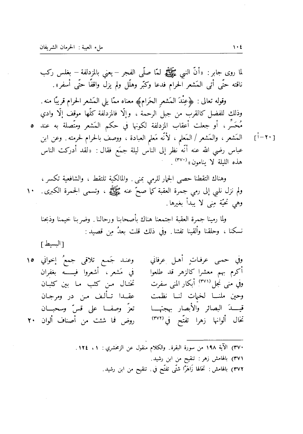 وقوله تعالى:] عِنْدَ الْمَشْعَرِ الْحَرَامِ} [سورة البقرة: 198] معناه مما يلي المشعر الحرام قريبا منه وذلك للفضل كالقرب من جبل الرحمة، وإلا فالمزدلفة كلها موقف إلا وادي محسر، أو جعلت أعقاب المزدلفة لكونها في حكم المشعر ومتصلة به عند المشعر، والمشعر المعلم، لأنه معلم العبادة، ووصف بالحرام لحرمته، وعن ابن عباس رضي الله عنه أنه نظر إلى الناس ليلة جمع، فقال: «لقد أدركت الناس هذه الليلة لا ينامون» .