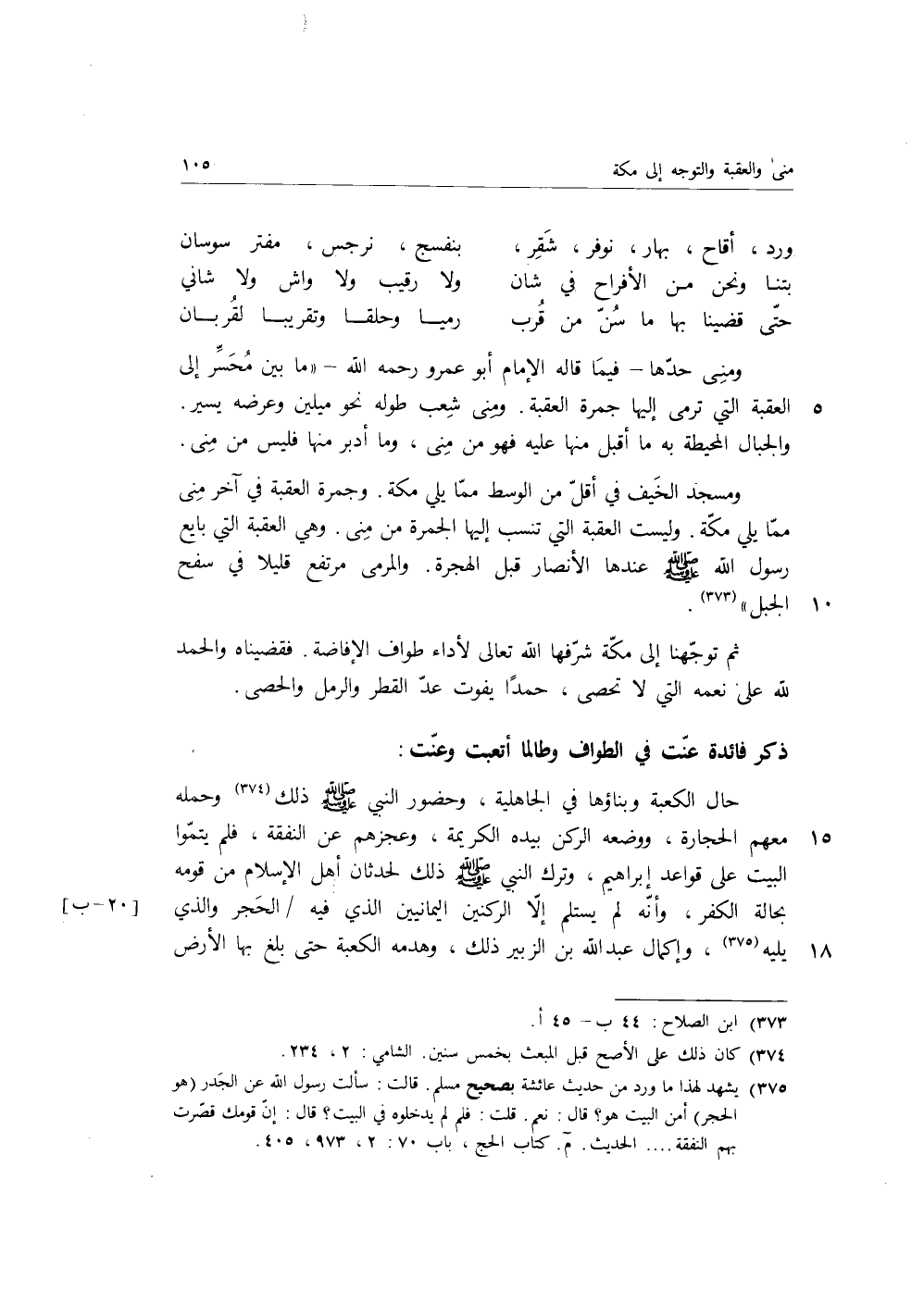 ذكر فائدة عنت في الطواف وطالما أتعبت وعنت: حال الكعبة وبناؤها في الجاهلية، وحضور النبي صَلَّى اللَّهُ عَلَيْهِ وَسَلَّمَ ذلك وحمله معهم الحجارة، ووضعه الركن بيده الكريمة، وعجزهم عن النفقة، فلم يتموا البيت على قواعد إبراهيم، وترك النبي صَلَّى اللَّهُ عَلَيْهِ وَسَلَّمَ ذلك لحدثان أهل الإسلام من قومه بحالة الكفر، وأنه لم يستلم إلا الركنين اليمانيين الذي فيه الحجر والذي يليه، وإكمال عبد الله بن الزبير ذلك، وهدمه الكعبة حتى بلغ بها الأرض