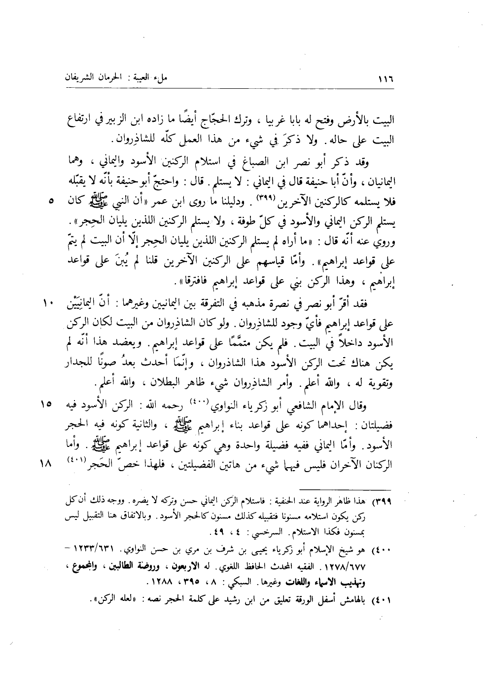 فقد أقر أبو نصر في نصرة مذهبة في التفرقة بين اليمانيين وغيرهما: أن اليمانيين على قواعد إبراهيم فأي وجود للشاذروان، ولو كان الشاذروان من البيت لكان الركن الأسود داخلًا في البيت، فلم يكن متمما على قواعد إبراهيم، ويعضد هذا أنه لم يكن هناك تحت الركن الأسود هذا الشاذروان، وإنما أحدث بعد صونا للجدار وتقوية له، والله أعلم، وأمر الشاذروان شيء ظاهر البطلان، والله أعلم.