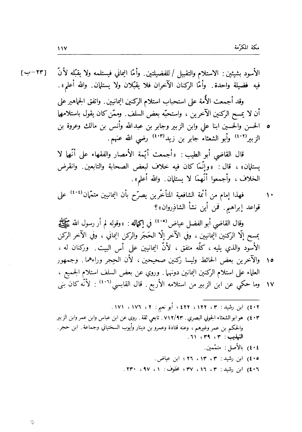 فمن أين نشأ الشاذروان؟ وقال القاضي أبو الفضل عياض في إكماله: «وقوله لم أر رسول الله صَلَّى اللَّهُ عَلَيْهِ وَسَلَّمَ يمسح إلا الركنين اليمانيين، وفي الآخر إلا الحجر والركن اليماني، وفى الآخر الركن الأسود والذي يليه، كله متفق، لأن اليمانيين على أس البيت، وركنان له، والآخرين بعض الحائط وليسا ركنين صحيحين، لأن الحجر وراءهما» ، وجمهور العلماء على استلام الركنين اليمانين دونهما، وروي عن بعض السلف استلام الجميع، وما حكي عن ابن الزبير من استلامه الأربع، قَالَ القابسي: لأنه كان بني