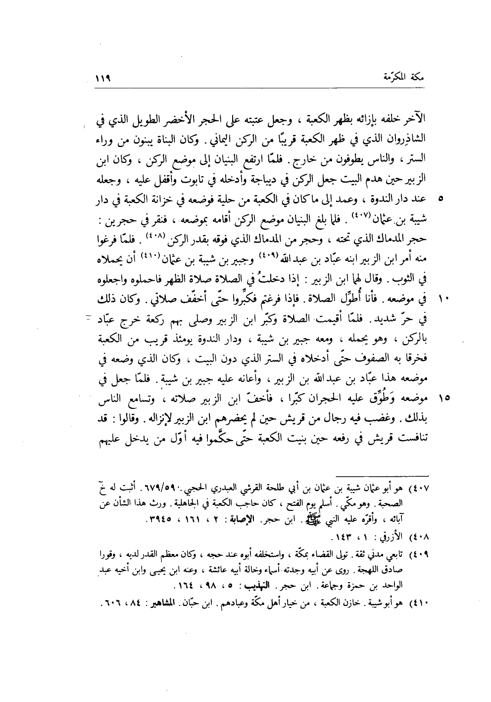 الآخر خلفه بإزائه بظهر الكعبة، وجعل عتبته على الحجر الأخضر الطويل الذي في الشاذروان الذي في ظهر الكعبة قريبا من الركن اليماني، وكان البناة يبنون من وراء الستر، والناس يطوفون من خارج، فلما ارتفع البنيان إلى موضع الركن، وكان ابن الزبير حين هدم البيت جعل الركن في ديباجة وأدخله في تابوت وأقفل عليه، وجعله عند دار الندوة، وعمد إلى ما كان في الكعبة من حلية فوضعه في خزانة الكعبة في دار شيبة بن عثمان، فلما بلغ البنيان موضع الركن أقامه بموضعه، فنقر في حجرين: حجر المدماك الذي تحته، وحجر من المدماك الذي فوقه بقدر الركن، فلما فرغوا منه أمر ابن الزبير ابنه عباد بن عبد الله، وجبير بن شيبة بن عثمان، أن يحملاه في الثوب، وقال لهما ابن الزبير: إذا دخلت في الصلاة صلاة الظهر فاحملوه واجعلوه في موضعه، فأنا أطول الصلاة، فإذا فرغتم فكبروا حتى أخفف صلاتي، وكان ذلك في حر شديد، فلما أقيمت الصلاة وكبر ابن الزبير وصلى بهم ركعة خرج عباد بالركن، وهو يحمله، ومعه جبير بن شيبة، ودار الندوة يومئذ قريب من الكعبة فخرقا به الصفوف حتى أدخلاه في الستر الذي دون البيت، وكان الذي وضعه في موضعه هذا عباد بن عبد الله بن الزبير، وأعانه عليه جبير بن شيبة، فلما جعل في موضعه وطوق عليه الحجران كبرا، فأخف ابن الزبير صلاته، وتسامع الناس بذلك، وغضب فيه رجال من قريش حين لم يحضرهم ابن الزبير لإنزاله، وقالوا: قد تنافست قريش في رفعه حين بنيت الكعبة، حتى حكموا فيه أول من يدخل عليهم