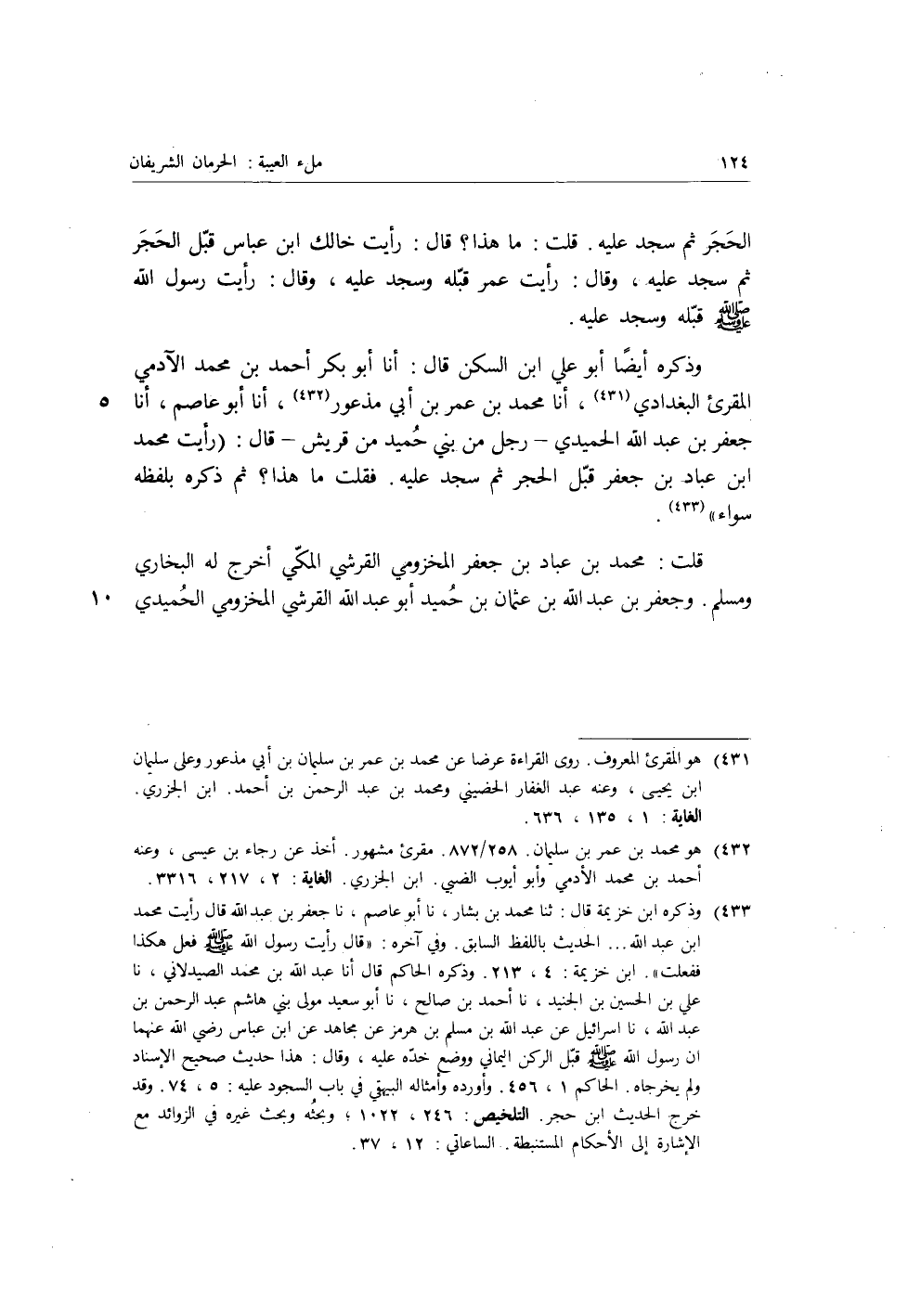 وذكره أيضا أبو علي بن السكن، قَالَ: أنا أبو بكر أحمد بن محمد الآدمي المقرئ البغدادي، أنا محمد بن عمر بن أبي مذعور، أنا أبو عاصم، أنا جعفر بن عبد الله الحميدي، رجل من بني حميد من قريش، قَالَ: «رأيت محمد بن عباد بن جعفر قبل الحجر ثم سجد عليه، فقلت ما هذا؟ ثم ذكره بلفظه سواء» .