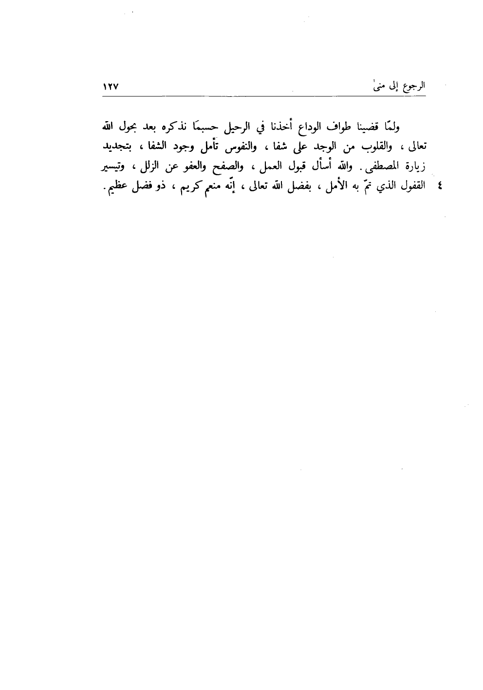 ولما قضينا طواف الوداع أخذنا في الرحيل حسبما نذكره بعد بحول الله تعالى، والقلوب من والوجد على شفا، والنفوس تأمل وجود الشفا، بتجديد زيارة المصطفى، والله أسأل قبول العمل، والصفح والعفو عن الزلل، وتيسير القفول الذي تم به الأمل، بفضل الله تعالى، إنه منعم كريم، ذو فضل عظيم.