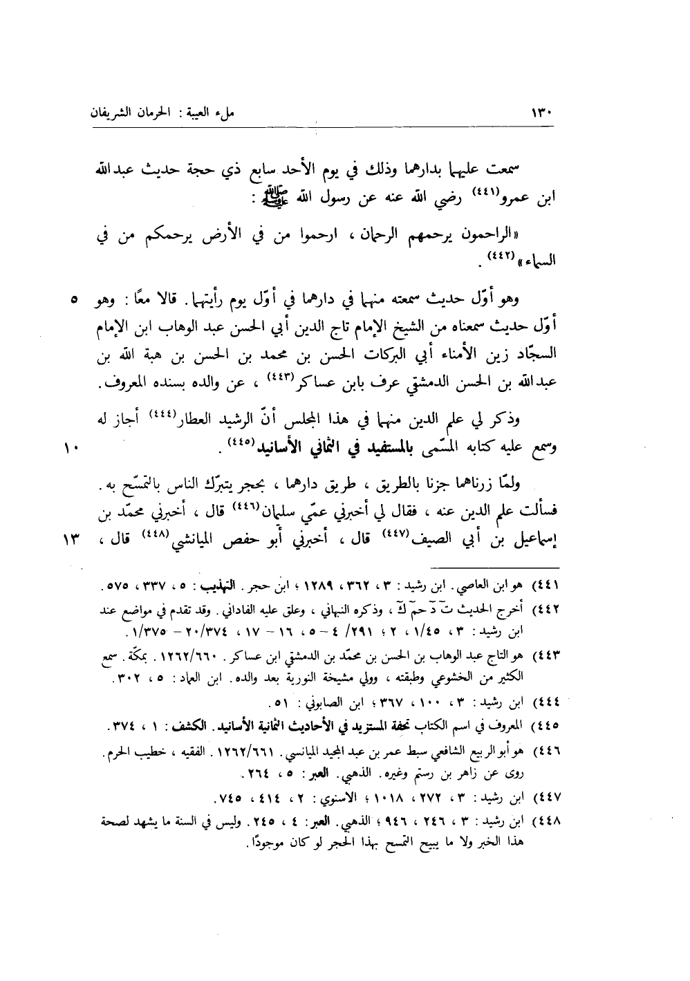 وهو أول حديث سمعته منهما في دارهما في أول يوم رأيتهما، قالا معا: وهو أول حديث سمعناه من الشيخ الإمام تاج الدين أبي الحسن عبد الوهاب بن الإمام السجاد زين الأمناء أبي البركات الحسن بن مُحَمَّدِ بْنِ الحسن بن هبة الله بن عبد الله بن الحسن الدمشقي عرف بابن عساكر، عن والده بسنده المعروف، وذكر لي علم الدين منهما في هذا المجلس أن الرشيد العطار أجاز له وسمع عليه كتابه المسمى بالمستفيد في الثماني الأسانيد.