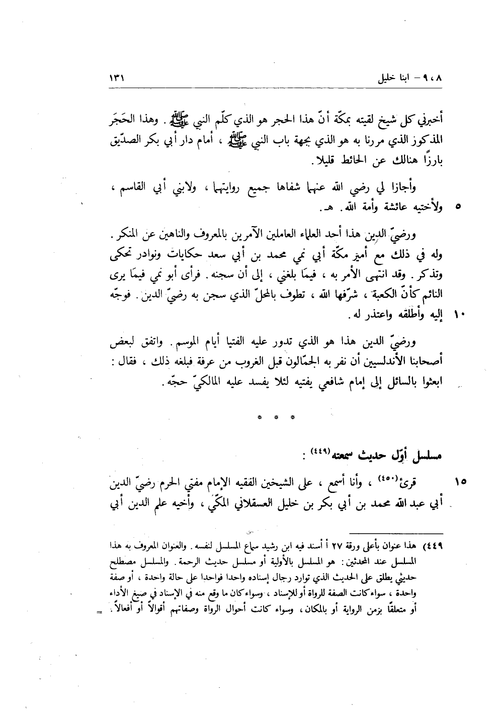 مسلسل أو حديث سمعته: قرئ وَأَنَا أَسْمَعُ، على الشيخين الفقيه الإمام مفتي الحرم رضي الدين أبي عبد الله محمد بن أبي بكر بن خليل العسقلاني المكي، وأخيه علم الدين أبي