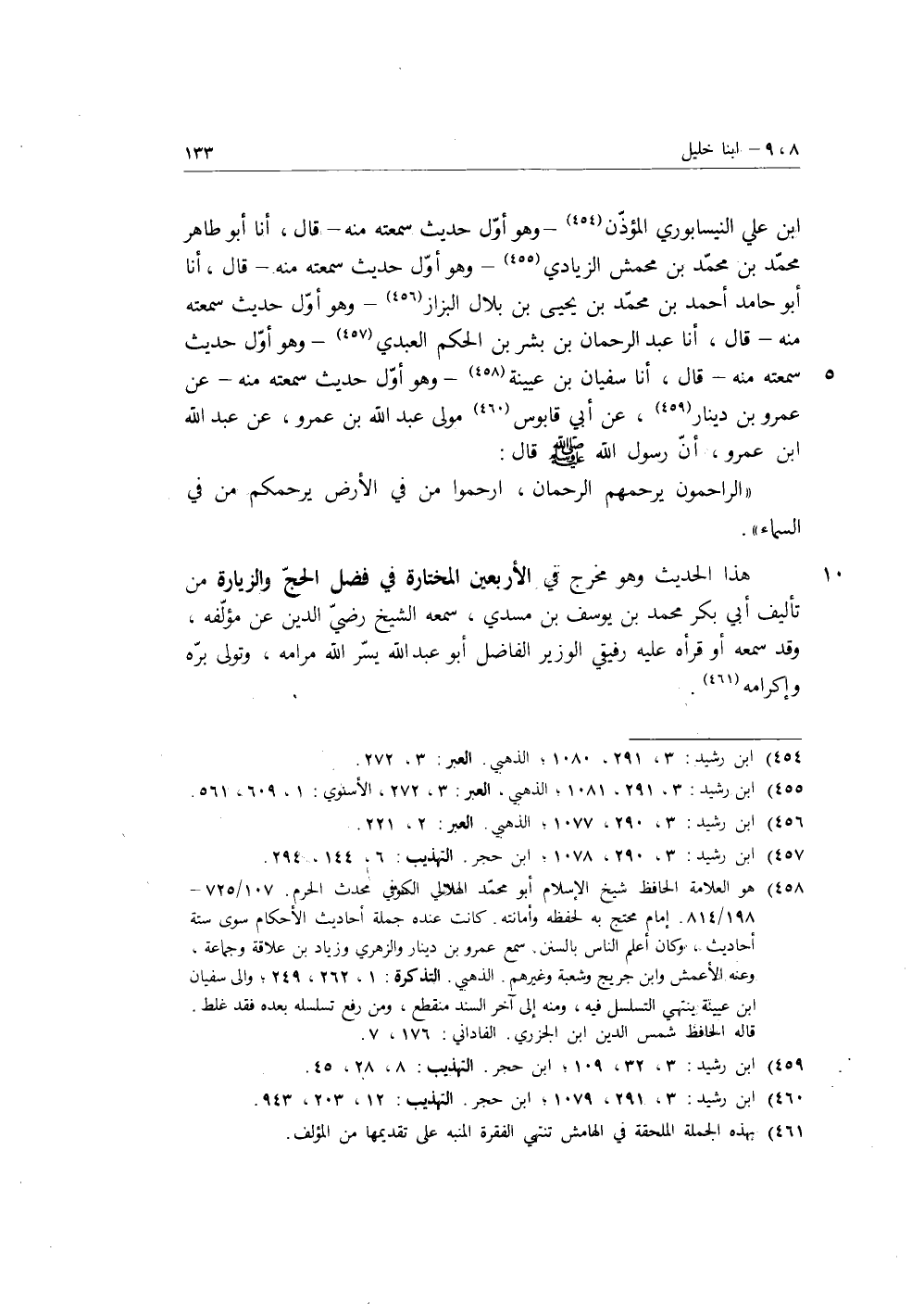 بْنِ عَلِيٍّ النَّيْسَابُورِيُّ الْمُؤَذِّنُ، وَهُوَ أَوَّلُ حَدِيثٍ سَمِعْتُهُ مِنْهُ، قَالَ: أنا أَبُو طَاهِرٍ مُحَمَّدُ بْنُ مُحَمَّدِ بْنِ مَحْمَشَ الزِّيَادِيُّ، وَهُوَ أَوَّلُ حَدِيثٍ سَمِعْتُهُ مِنْهُ، قَالَ: أنا أَبُو حَامِدٍ أَحْمَدُ بْنُ مُحَمَّدِ بْنِ يَحْيَى بْنِ بِلالٍ الْبَزَّازُ، وَهُوَ أَوَّلُ حَدِيثٍ سَمِعْتُهُ مِنْهُ قَالَ، أنا عَبْدُ الرَّحْمَنِ بْنُ بِشْرِ بْنِ الْحَكَمِ الْعَبْدِيُّ، وَهُوَ أَوَّلُ حَدِيثٍ سَمِعْتُهُ مِنْهُ، قَالَ، أنا سُفْيَانُ بْنُ عُيَيْنَةَ، وَهُوَ أَوَّلُ حَدِيثٍ سَمِعْتُهُ مِنْهُ عَنْ عَمْرِو بْنِ دِينَارٍ، عَنْ أَبِي قَابُوسٍ، مَوْلَى عَبْدِ اللَّهِ بْنِ عَمْرٍو، عَنْ عَبْدِ اللَّهِ بْنِ عَمْرٍو، أَنَّ رَسُولَ اللَّهِ صَلَّى اللَّهُ عَلَيْهِ وَسَلَّمَ، قَالَ: «