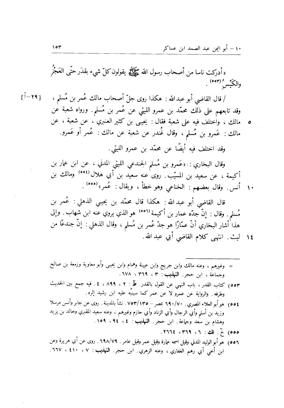 قال القاضي أبو عبد الله: هكذا روى جل أصحاب مالك عمر بن مسلم وقد تابعهم على ذلك محمد بن عمرو الليثي، عن عمر بن مسلم، ورواه شعبة عن مالك، واختلف فيه على شعبة فقال: يحيى بن كثير العنبري، عن شعبة، عن مالك: عمرو بن مسلم، وقال غندر عن شعبة، عن مالك: عمر أو عمرو.
