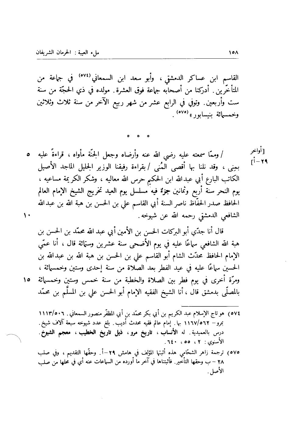 قَالَ أنا جَدِّي أَبُو الْبَرَكَاتِ الْحَسَنُ بْنُ الأَمِينِ أَبِي عَبْدِ اللَّهِ مُحَمَّدِ بْنِ الْحَسَنِ بْنِ هِبَةِ اللَّهِ الشَّافِعِيُّ سَمَاعًا عَلَيْهِ فِي يَوْمِ الأَضْحَى سَنَةَ عِشْرِينَ وَسِتِّ مِائَةٍ، قَالَ: أنا عَمِّي الإِمَامُ الْحَافِظُ مُحَدِّثُ الشَّامِ أَبُو الْقَاسِمِ عَلِيُّ بْنُ الْحَسَنِ بْنِ هِبَةِ اللَّهِ بْنِ عَبْدِ اللَّهِ بْنِ الْحُسَيْنِ سَمَاعًا عَلَيْهِ فِي عِيدِ الْفِطْرِ بَعْدَ الصَّلاةِ مِنْ سَنَةِ إِحْدَى وَسِتِّينَ وَخَمْسِ مِائَةٍ، وَمَرَّةً أُخْرَى فِي يَوْمِ فِطْرٍ بَيْنَ الصَّلاةِ وَالْخُطْبَةِ مِنْ سَنَةِ خَمْسٍ وَسِتِّينَ وَخَمْسِ مِائَةٍ بِالْمُصَلَّى بِدِمَشْقَ، قَالَ: أنا الشَّيْخُ الْفَقِيهُ الإِمَامُ أَبُو الْحَسَنِ عَلِيُّ بْنُ الْمُسْلِمِ بْنِ مُحَمَّدِ
