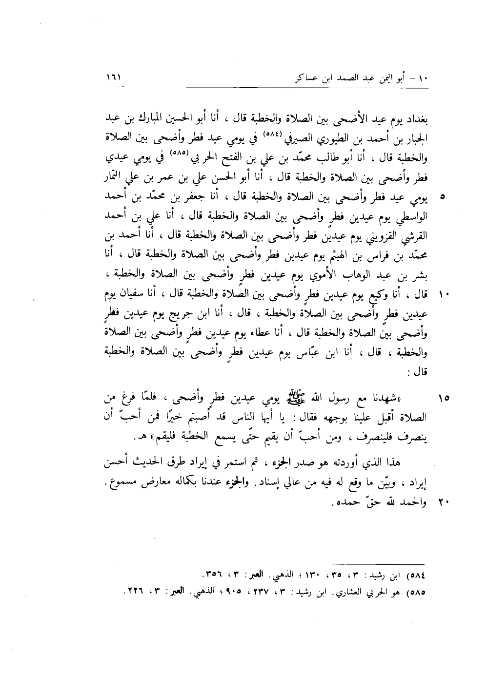 بَغْدَادَ يَوْمَ عِيدِ الأَضْحَى بَيْنَ الصَّلاةِ وَالْخُطْبَةِ، قَالَ: أنا أَبُو الْحُسَيْنِ الْمُبَارَكُ بْنُ عَبْدِ الْجَبَّارِ بْنِ أَحْمَدَ بْنِ الطَّيُّورِيُّ الصَّيْرَفِيُّ، فِي يَوْمَيْ عِيدِ فِطْرٍ وَأَضْحًى بَيْنَ الصَّلاةِ وَالْخُطْبَةِ، قَالَ: أنا أَبُو طَالِبٍ مُحَمَّدُ بْنُ عَلِيِّ بْنِ الْفَتْحِ الْحَرْبِيُّ، فِي يَوْمَيْ عِيدَيْ فِطْرٍ وَأْضَحًى بَيْنَ الصَّلاةِ وَالْخُطْبَةِ، قَالَ: أنا أَبُو الْحَسَنِ عَلِيُّ بْنُ عُمَرَ بْنِ عَلِيٍّ التَّمَّارُ يَوْمَيْ عِيدِ فِطْرٍ وَأَضْحًى بَيْنَ الصَّلاةِ وَالْخُطْبَةِ، قَالَ: أنا جَعْفَرُ بْنُ مُحَمَّدِ بْنِ أَحْمَدَ الْوَاسِطِيُّ يَوْمَ عِيدَيْنِ فِطْرٍ وَأَضْحًى بَيْنَ الصَّلاةِ وَالْخُطْبَةِ، قَالَ: أنا عَلِيُّ بْنُ أَحْمَدَ الْقُرَشِيُّ الْقَزْوِينِيُّ يَوْمَ عِيدَيْنِ فِطْرٍ وَأَضْحًى بَيْنَ الصَّلاةِ وَالْخُطْبَةِ قَالَ: أنا أَحْمَدُ بْنُ مُحَمَّدِ بْنِ فِرَاسِ بْنِ الْهَيْثَمِ، يَوْمَ عِيدَيْنِ فِطْرٍ وَأَضْحًى بَيْنَ الصَّلاةِ وَالْخُطْبَةِ، أنا بِشْرُ بْنُ عَبْدِ الْوَهَّابِ الأُمَوِيُّ يَوْمَ عِيدَيْنِ فِطْرٍ وَأَضْحًى بَيْنَ الصَّلاةِ وَالْخُطْبَةِ، قَالَ، أنا وكيع يَوْمَ عِيدَيْنِ فِطْرٍ وَأَضْحًى بَيْنَ الصَّلاةِ وَالْخُطْبَةِ، قَالَ: أنا سُفْيَانُ يَوْمَ عِيدَيْنِ فِطْرٍ وَأَضْحًى بَيْنَ الصَّلاةِ وَالْخُطْبَةِ، قَالَ: أنا ابْنُ جُرَيْجٍ يَوْمَ عِيدَيْنِ فِطْرٍ وَأَضْحًى بَيْنَ الصَّلاةِ وَالْخُطْبَةِ، قَالَ: أنا عَطَاءٌ يَوْمَ عِيدَيْنِ فِطْرٍ وَأَضْحًى بَيْنَ الصَّلاةِ وَالْخُطْبَةِ، قَالَ: أنا ابْنُ عَبَّاسٍ، يَوْمَ عِيدَيْنِ فِطْرٍ وَأَضْحًى بَيْنَ الصَّلاةِ وَالْخُطْبَةِ، قَالَ: "