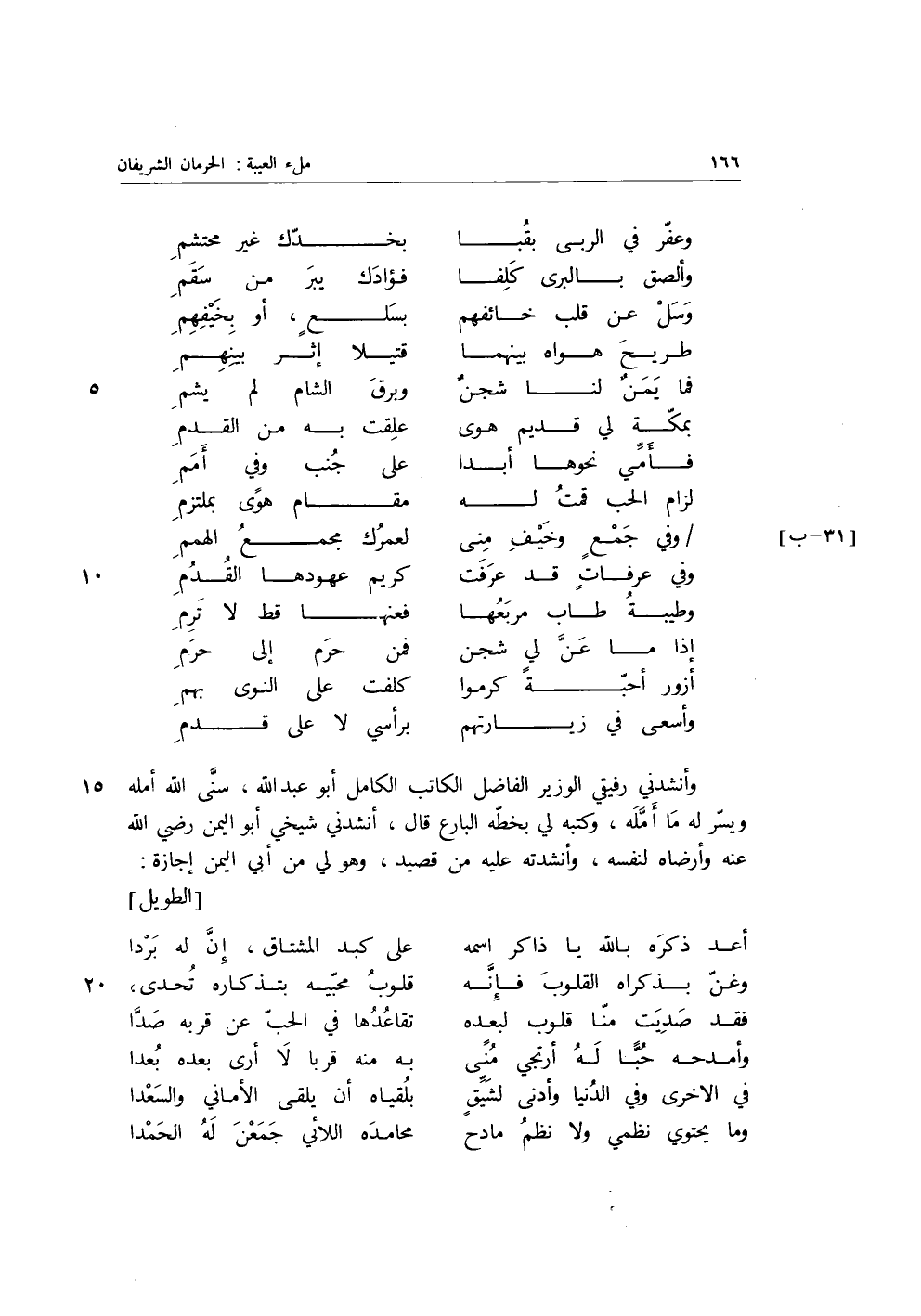 وأنشدني رفيقي الوزير الفاضل الكاتب الكامل أبو عبد الله، سنى الله أمله ويسر له ما أمله، وكتبه لي بخطه البارع، قَالَ: أنشدني شيخي أبو اليمن رضي الله عنه وأرضاه لنفسه، وأنشدته عليه من قصيد، وهو لي من أبي اليمن إجازة.
