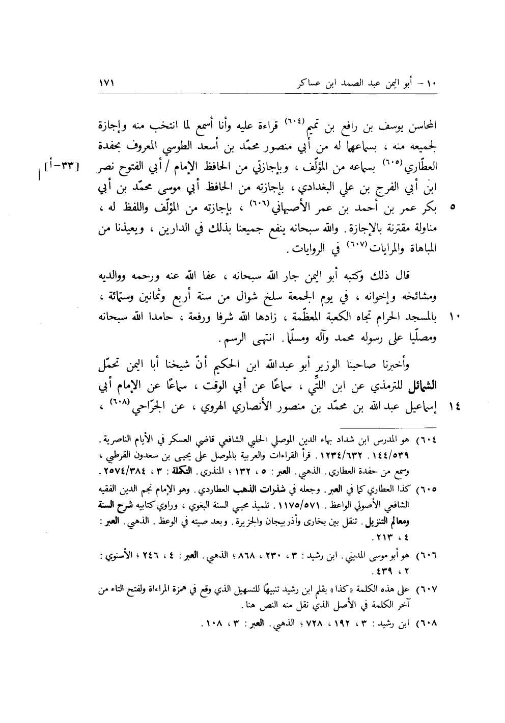 وأخبرنا صاحبنا الوزير أبو عبد الله بن الحكيم أن شيخنا أبا اليمن تحمل الشمائل للترمذي عن ابن اللتي، سماعا عن أبي الوقت، سماعا عن الإمام أبي إسماعيل عبد الله بن مُحَمَّدِ بْنِ منصور الأنصاري الهروي عن الجراحي.