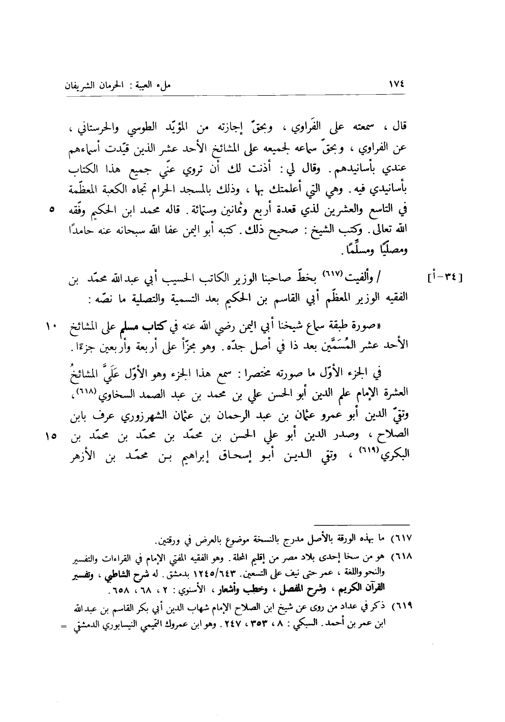 قَالَ: سمعته على الْفُرَاوِيّ، وبحق إجازته من المؤيد الطوسي والحرستاني عن الْفُرَاوِيّ، وبحق سماعه لجميعه على المشائخ الأحد عشر الذين قيدت أسماءهم عندي بأسانيدهم، وقال لي: أذنت لك أن تروي عني جميع هذا الكتاب بأسانيدي فيه، وهي التي أعلمتك بها، وذلك بالمسجد الحرام تجاه الكعبة المعظمة في التاسع والعشرين لذي قعدة أربع وثمانين وست مائة، قاله محمد بن الحكيم وفقه الله تعالى، وكتب الشيخ، صحيح ذلك، كتبه أبو اليمن عفا الله سبحانه عنه حامدا ومصليا ومسلما.