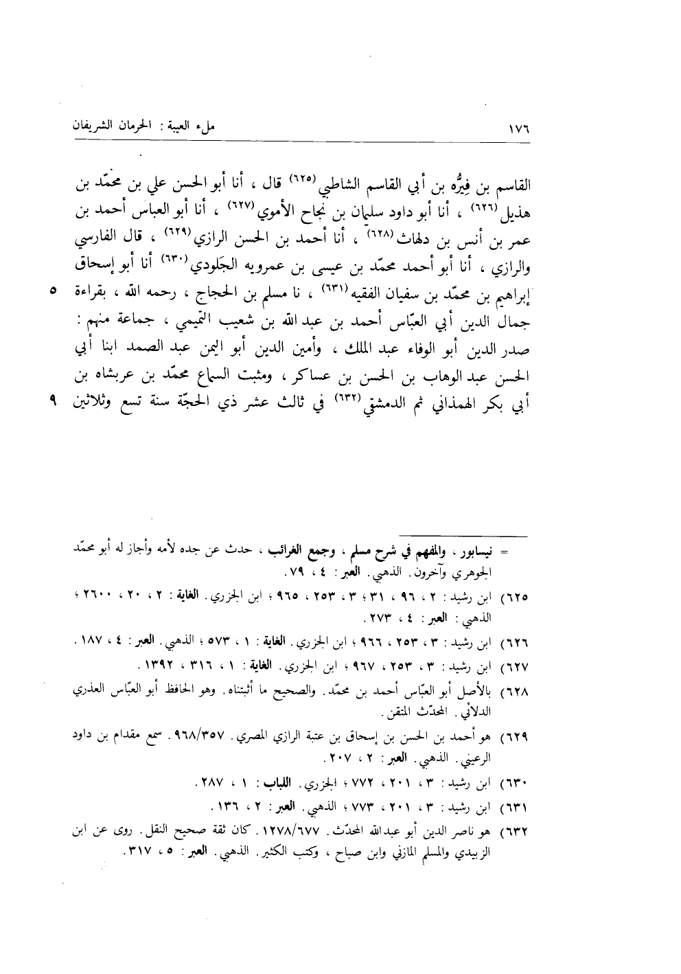 الْقَاسِمِ فيره بْنُ أَبِي الْقَاسِمِ بْنِ الشَّاطَبِيِّ، قَالَ: أنا أَبُو الْحَسَنِ عَلِيُّ بْنُ مُحَمَّدِ بْنِ هُذَيْلٍ، أنا أَبُو دَاوُدَ سُلَيْمَانُ بْنُ نَجَاحٍ الأُمَوِيُّ، أنا أَبُو الْعَبَّاسِ أَحْمَدُ بْنُ عُمَرَ بْنِ أَنَسِ بْنِ دلهاث، أنا أَحْمَدُ بْنُ الْحَسَنِ الرَّازِيُّ، قَالَ الْفَارِسِيُّ وَالرَّازِيُّ، أنا أَبُو أَحْمَدَ مُحَمَّدُ بْنُ عِيسَى بْنِ عَمْرَوَيْهِ الْجُلُودِيُّ، أنا أَبُو إِسْحَاقَ إِبْرَاهِيمُ بْنُ مُحَمَّدِ بْنِ سُفْيَانَ الْفَقِيهُ، نا مُسْلِمُ بْنُ الْحَجَّاجِ، رَحِمَهُ اللَّهُ بِقِرَاءَةِ جَمَالِ الدِّينِ أَبِي الْعَبَّاسِ أَحْمَدَ بْنِ عَبْدِ اللَّهِ بْنِ شُعَيْبٍ التَّمِيمِيُّ، جَمَاعَةٌ مِنْهُمْ: صَدْرُ الدِّينِ أَبُو الْوَفَاءِ عَبْدُ الْمَلِكِ، وَأَمِينُ الدِّينِ أَبُو الْيُمْنِ عَبْدُ الصَّمَدِ ابْنَا أَبِي الْحَسَنِ عَبْدُ الْوَهَّابِ بْنُ الْحَسَنِ بْنِ عَسَاكِرَ، وَمُثْبَتُ السَّمَاعِ مُحَمَّدُ بْنُ عَرَبْشَاهْ بْنِ أَبِي بَكْرٍ الْهَمَذَانِيُّ، ثُمَّ الدِّمَشْقِيُّ، فِي ثَالِثَ عَشَرَ ذِي الْحِجَّةِ سَنَةَ تِسْعٍ وَثَلاثِينَ