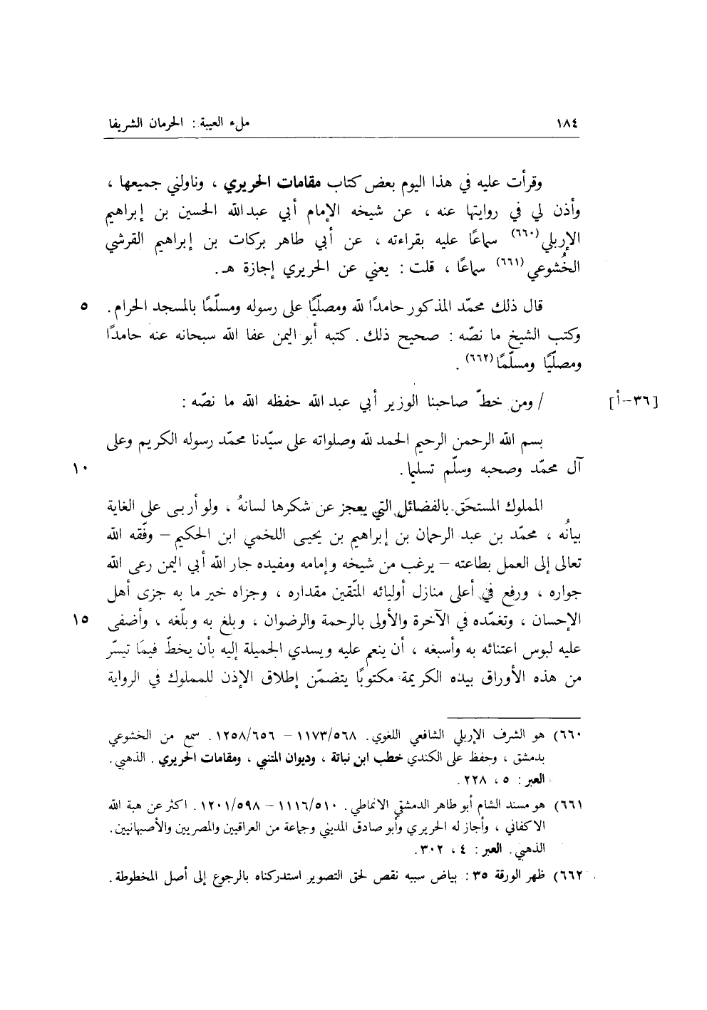 وقرأت له في هذا اليوم بعض كتاب مقامات الحريري، وناولني جميعها وأذن لي في روايتها عنه، عن شيخه الإمام أبي عبد الله الحسين بن إِبْرَاهِيمَ الإربلي، سماعا عليه بقرءاته، عن أبي طاهر بركات بن إِبْرَاهِيمَ القرشي الخشوعي، سماعا، قلت: يعني عن الحريري إجازة.