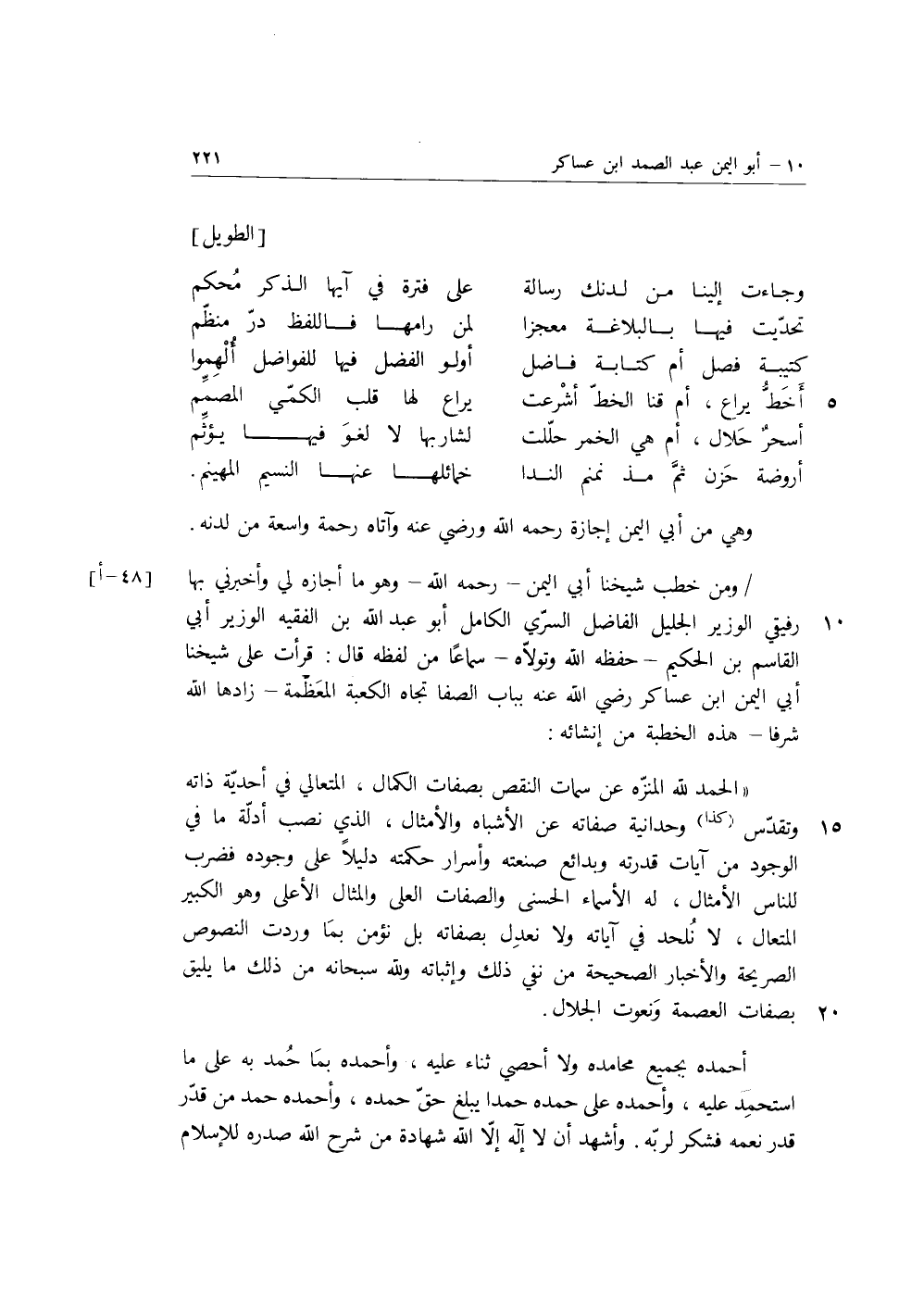 ومن خطب شيخنا أبي اليمن رَحِمَهُ اللَّهُ وهو ما أجازه لي وأخبرني بها رفيقي الوزير الجليل الفاضل السري الكامل أبو عبد الله بن الفقيه الوزير أبي القاسم بن الحكيم، حفظه الله وتولاه، سماعا من لفظه قَالَ: قرأت على شيخنا أبي اليمن بن عساكر رضي الله عنه بباب الصفا تجاه الكعبة المعظمة زادها الله شرفا، هذه الخطبة من إنشائه.
