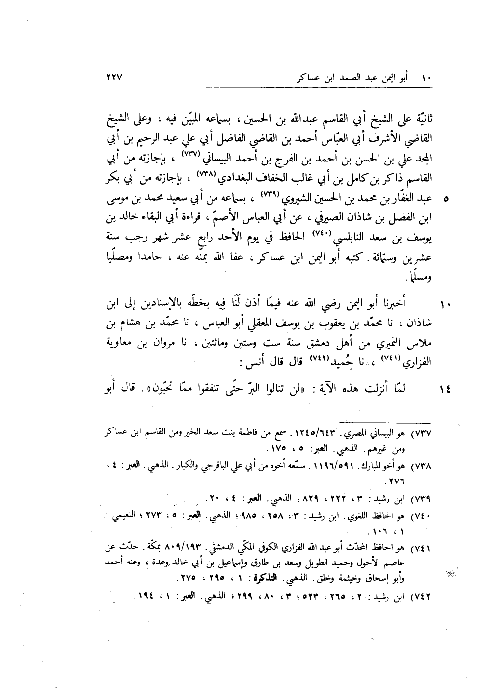 أَخْبَرَنَا أَبُو الْيُمْنِ رَضِيَ اللَّهُ عَنْهُ فِيمَا أَذِنَ لَنَا فِيهِ بِخَطِّهِ بِالإِسْنَادَيْنِ إِلَى ابْنِ شَاذَانَ، نا مُحَمَّدُ بْنُ يَعْقُوبَ بْنِ يُوسُفَ الْمَعْقِلِيُّ أَبُو الْعَبَّاسِ، نا مُحَمَّدُ بْنُ هِشَامِ بْنِ مَلاسٍ النُّمَيْرِيُّ مِنْ أَهْلِ دِمَشْقَ سَنَةَ سِتٍّ وَسِتِّينَ وَمِائَتَيْنِ، نا مَرْوَانُ بْنُ مُعَاوِيَةَ الْفَزَارِيُّ، نا حُمَيْدٌ، قَالَ، قَالَ أَنَسٌ: