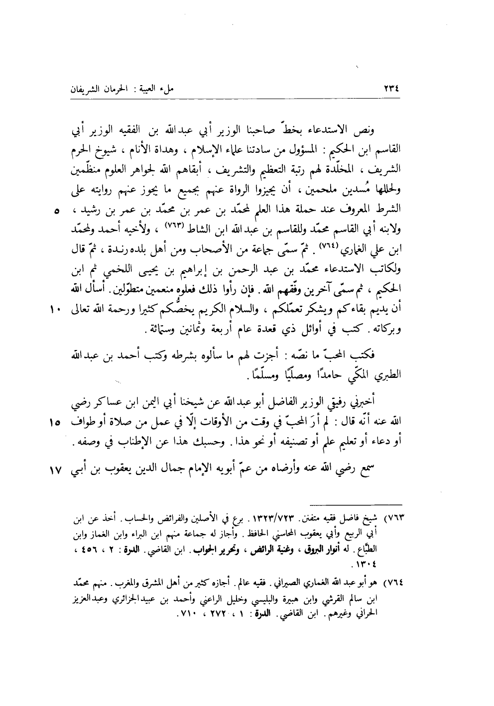 ونص الاستدعاء بخط صاحبنا الوزير أبي عبد الله بن الفقيه الوزير أبي القاسم بن الحكيم: المسئول من سادتنا علماء الإسلام، وهداة الأنام، شيوخ الحرم الشريف، المخلدة لهم رتبة التعظيم والتشريف، أبقاهم الله لجواهر العلوم منظمين ولحللها مسدين ملحمين، أن يجيزوا الرواة عنهم بجميع ما يجوز عنهم روايته على الشرط المعروف عند حملة هذا العلم لمحمد بن عُمَرَ بْنِ مُحَمَّدِ بْنِ عمر بن رشيد، ولابنه أبي القاسم محمد وللقاسم بن عبد الله بن الشاط، ولأخيه أحمد ولمحمد بن عَلِيٍّ الغماري، ثم سمى جماعة من الأصحاب ومن أهل بلده رندة، ثم قَالَ ولكاتب الاستدعاء، محمد بن عبد الرحمن، بن إِبْرَاهِيمَ بْنِ يحيى اللخمي، ثم ابن الحكيم، ثم سمى آخرين وفقهم الله، فإن رأوا ذلك فعلوه منعمين متطولين، أسأل الله أن يديم بقاءكم ويشكر تعملكم، والسلام الكريم يخصكم كثيرا ورحمة الله تعالى وبركاته، كتب في أوائل ذي قعدة، عام أربعة وثمانين وست مائة.