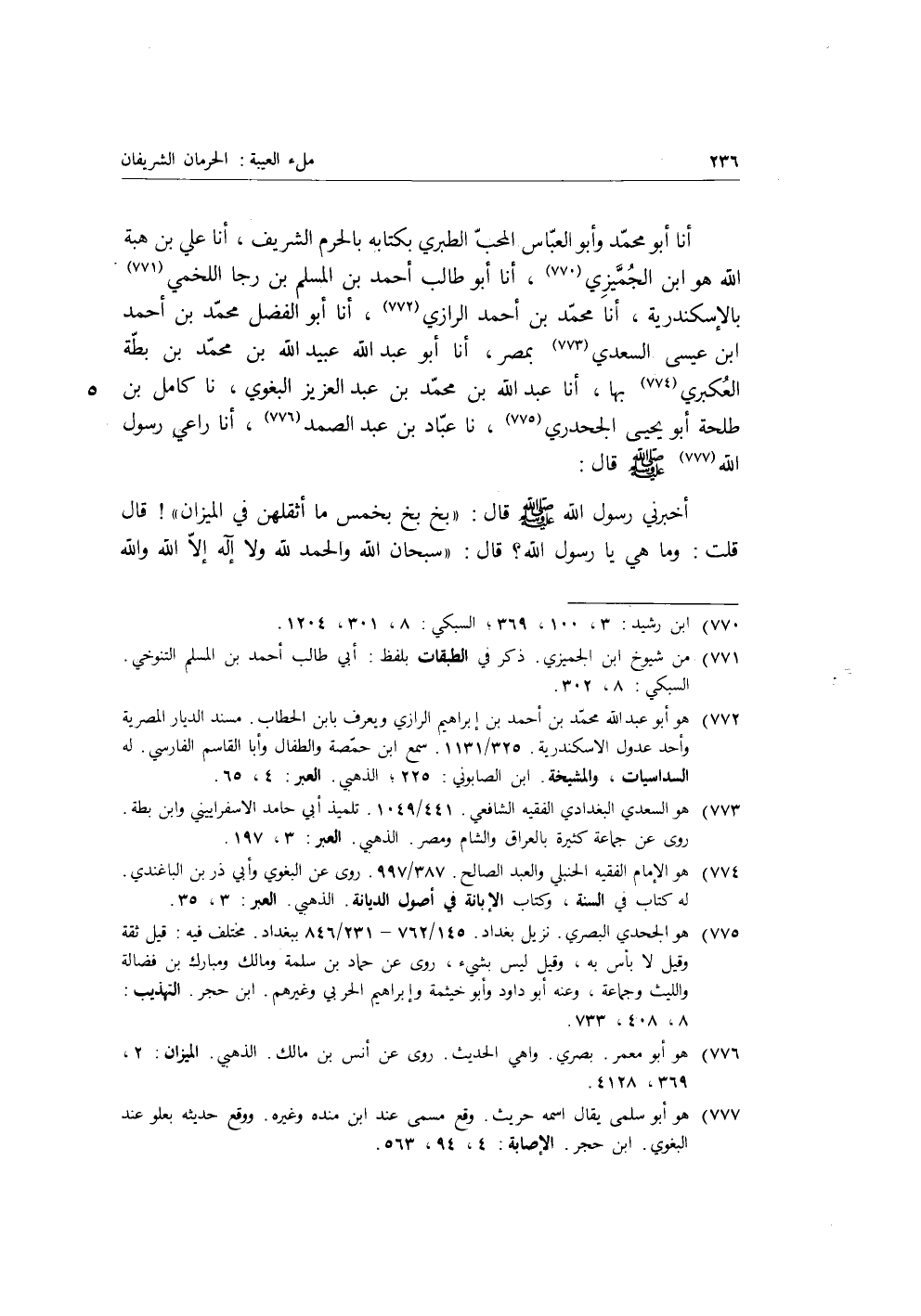 أنا أَبُو مُحَمَّدٍ وَأَبُو الْعَبَّاسِ الْمُحِبُّ الطَّبَرِيُّ بِكِتَابِهِ بِالْحَرَمِ الشَّرِيفِ، أنا عَلِيُّ بْنُ هِبَةِ اللَّهِ هُوَ ابْنُ الْجَمِيزِيِّ، أنا أَبُو طَالِبٍ أَحْمَدُ بْنُ الْمُسْلِمِ بْنِ رَجَا اللَّخْمِيُّ، أنا مُحَمَّدُ بْنُ أَحْمَدَ الرَّازِيُّ، أنا أَبُو الْفَضْلِ مُحَمَّدُ بْنُ أَحْمَدَ بْنِ عِيسَى السَّعْدِيُّ بِمِصْرَ، أنا أَبُو عَبْدِ اللَّهِ عُبَيْدُ اللَّهِ بْنُ مُحَمَّدِ بْنِ بَطَّةَ الْعُكْبَرِيُّ بِهَا، أنا عَبْدُ اللَّهِ بْنُ مُحَمَّدِ بْنِ عَبْدِ الْعَزِيزِ الْبَغَوِيُّ، نا كَامِلُ بْنُ طَلْحَةَ أَبُو يَحْيَى الْجَحْدَرِيُّ، نا عَبَّادُ بْنُ عَبْدِ الصَّمَدِ، أنا رَاعِي رَسُولِ اللَّهِ صَلَّى اللَّهُ عَلَيْهِ وَسَلَّمَ، قَالَ: أَخْبَرَنِي رَسُولُ اللَّهِ صَلَّى اللَّهُ عَلَيْهِ وَسَلَّمَ، قَالَ: «