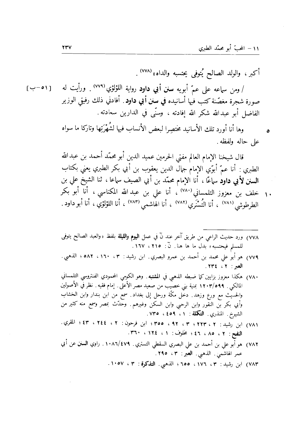 ومن سماعه على عم أبويه سنن أبي داود رواية اللؤلؤي، ورأيت له صورة شجرة مغصنة كتب فيها أسانيده في سنن أبي داود أفادني ذلك رفيقي الوزير الفاضل أَبُو عَبْدِ اللَّهِ شكر الله إفادته، وسنى في الدارين سعادته.