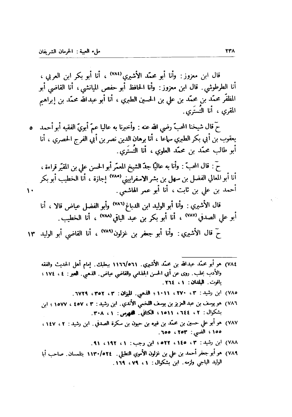 ح قَالَ شيخنا المحب رضي الله عنه: وأخبرنا به عاليا عم أبوي الفقيه أبو أحمد يعقوب بن أبي بكر الطبري سماعا، أنا برهان الدين نصر بن أبي الفرج الحصري، أنا أبو طالب محمد بن محمد العلوي، أنا التستري.