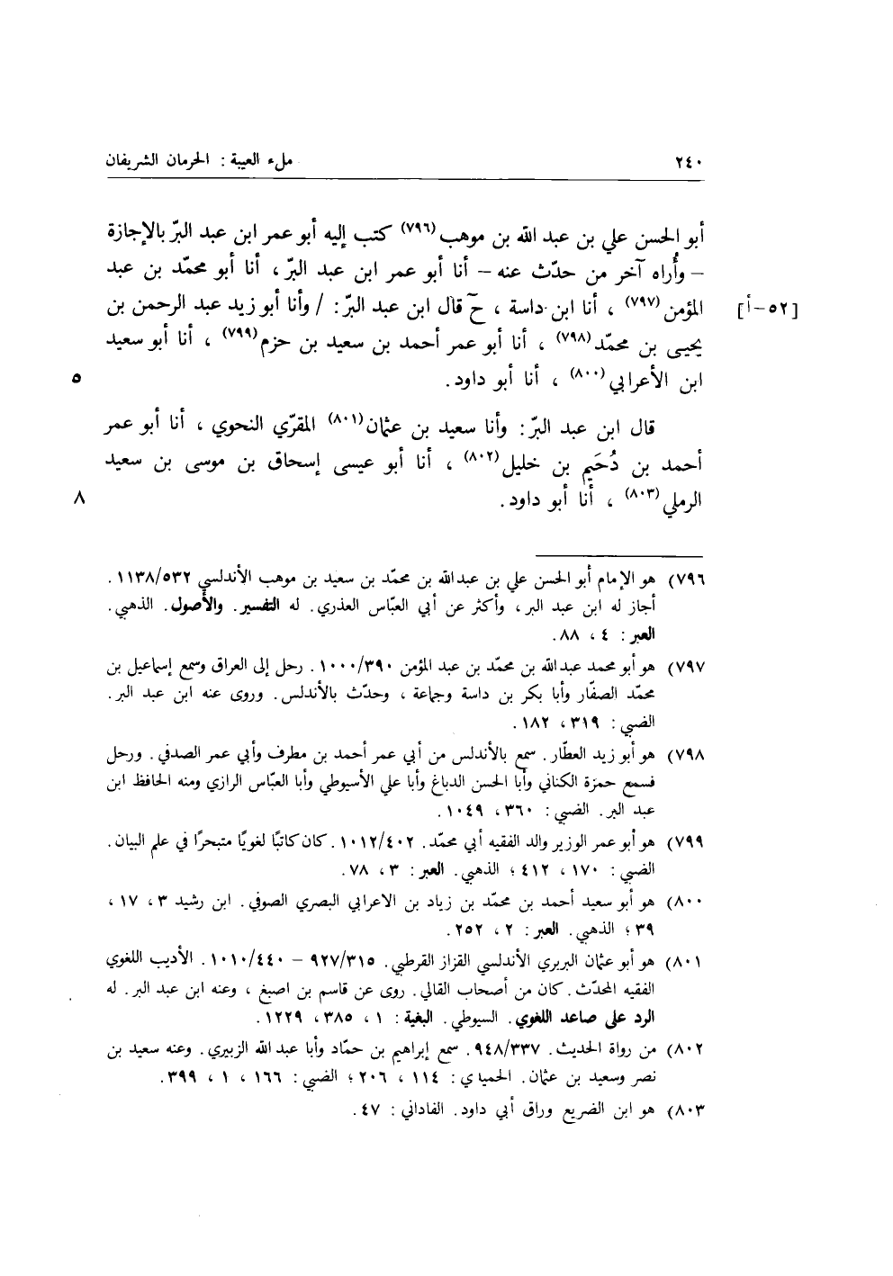 ح قَالَ ابن عبد البر: وأنا أبو زيد عبد الرحمن بن يحيى بن محمد، أنا أبو عمر أحمد بن سعيد بن حزم، أنا أبو سعيد ابن الأعرابي، أنا أبو داود.