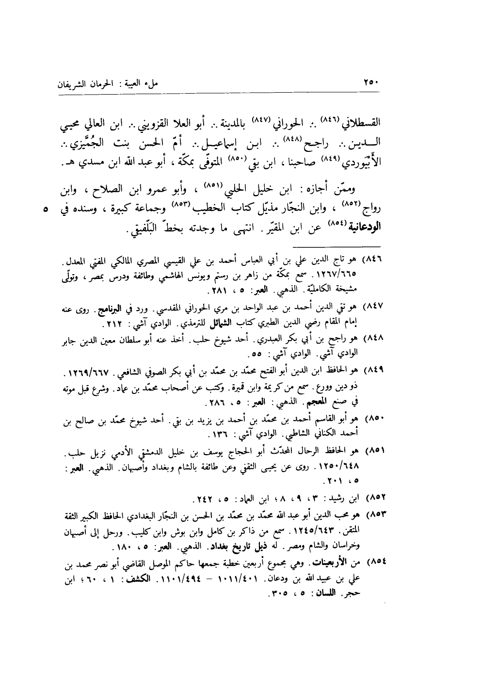 وبعض من ذكر لا أعرفه لتقصير التعريف الواقع بخط البلفيقي هنا، فليبحث عنهم، وبعضهم علم معروف، فالتبريزي، قد تقدم، وابن المقير، وأَبُو الْحَسَنِ بن الجميزي، وابن أبي حرمي، والجمال الطبري، وهم عم أبويه، يعقوب بن أبي بكر، وعلي الطبري هو تقي الدين أَبُو الْحَسَنِ وقد تقدم، وابن مسدي أيضا قد تقدم، وابن بقي المتوفي بمكة هو أَبُو الْقَاسِمِ أحمد بن مُحَمَّدِ بْنِ قاضي الجماعة أبي القاسم أحمد بن يزيد بن عَبْدِ الرَّحْمَنِ بن بقي، رَحِمَهُ اللَّهُ يروي عن جده أبي القاسم، وابن رواج وهو أبو محمد بن عبد الوهاب الإسكندري مشهور مكثر، وابن خليل الحلبي هو فيما نراه، أبو الحجاج يوسف بن الخليل بن عبد الله الدمشقي الحافظ وكان بحلب أيضا، ويحتمل أن يكون أخاه أبا إسحاق إبراهيم، وابن النجار صاحب ذيل كتاب الخطيب هو أَبُو عَبْدِ اللَّهِ محمد بن محمود بن مُحَمَّدِ بْنِ الحسن بن هِبَةِ اللَّهِ بن أبي القاسم بن عبد الله بن النجار البغدادي، والأبيوردي صاحبه هو محمد بن مُحَمَّدِ بْنِ أبي بكر الأبيوردي رَحِمَهُ اللَّهُ تعالى، وابن خليل المكي هو الفقيه الإمام أبو داود سليمان بن خليل العسقلاني إمام مقام إبراهيم الخليل عليه السلام، سمع عليه سنة ست وثلاثين وست مائة، والتاج
