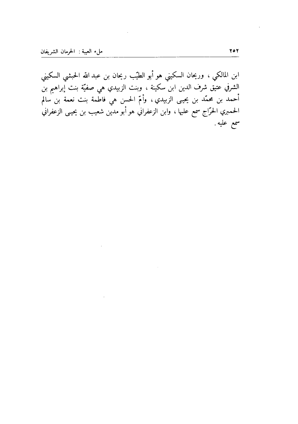 بن المالكي، وريحان السكيني هو أبو الطيب ريحان بن عبد الله الحبشي السكيني الشرفي عتيق شرف الدين بن سكينة، وبنت الزبيدي هي صفية بنت إبراهيم بن أَحْمَدَ بْنِ مُحَمَّدِ بْنِ يحيى الزبيدي، وأم الحسن هي فاطمة بنت نعمة بن سالم الحمبري الحراج سمع عليها، وابن الزعفراني هو أبو مدين شعيب بن يحيى الزعفراني سمع عليه.