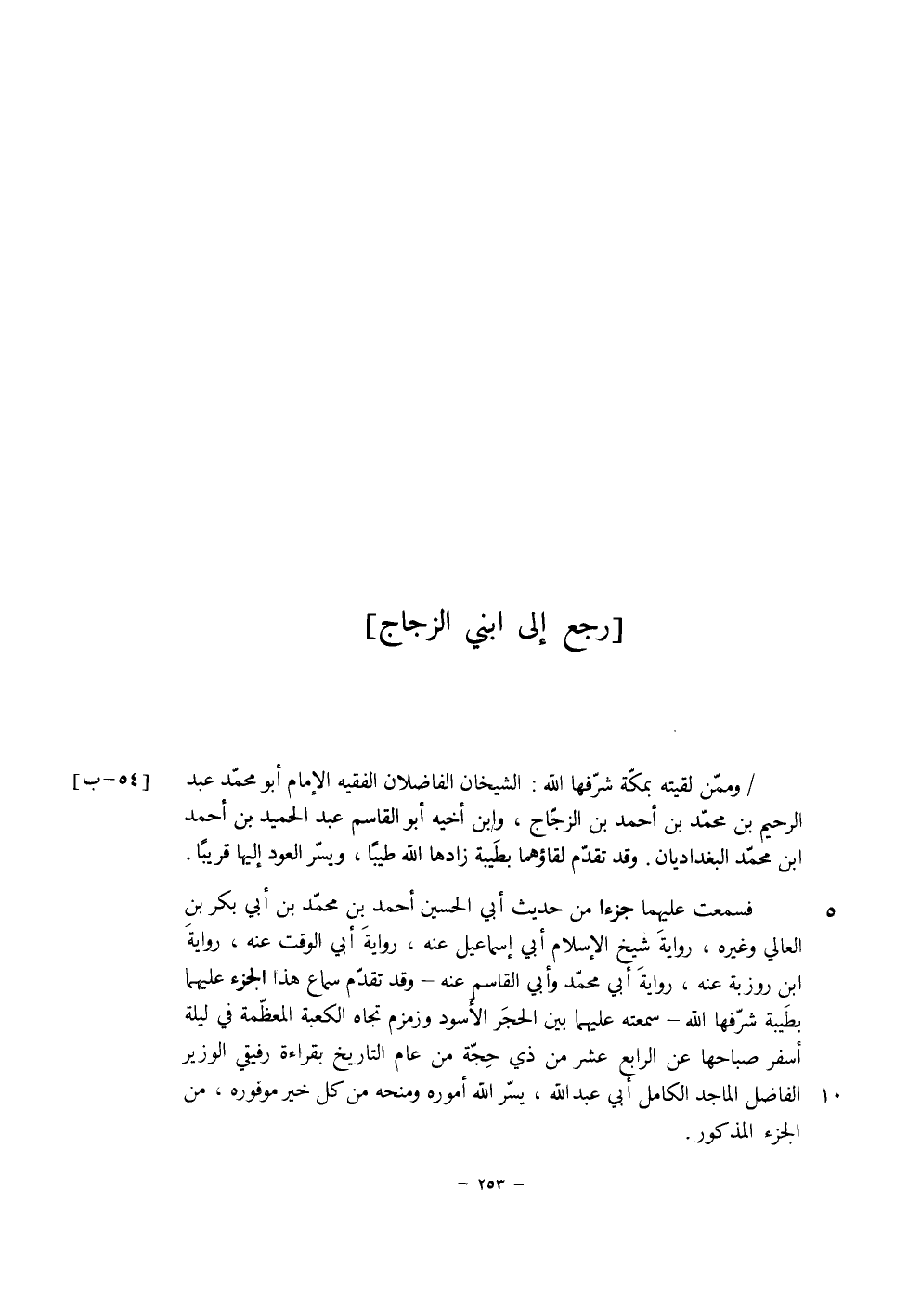 رجع إلى ابني الزجاج وممن لقيته بمكة شرفها الله، الشيخان الفاضلان الفقيه الإمام أبو محمد عبد الرحيم بن مُحَمَّدِ بْنِ أَحْمَدَ بن الزجاج، وابن أخيه أَبُو الْقَاسِمِ عبد الحميد بن أَحْمَدَ بْنِ محمد البغداديان، وقد تقدم لقاؤهما بطيبة زادها الله طيبا، ويسر العود إليها قريبا.
