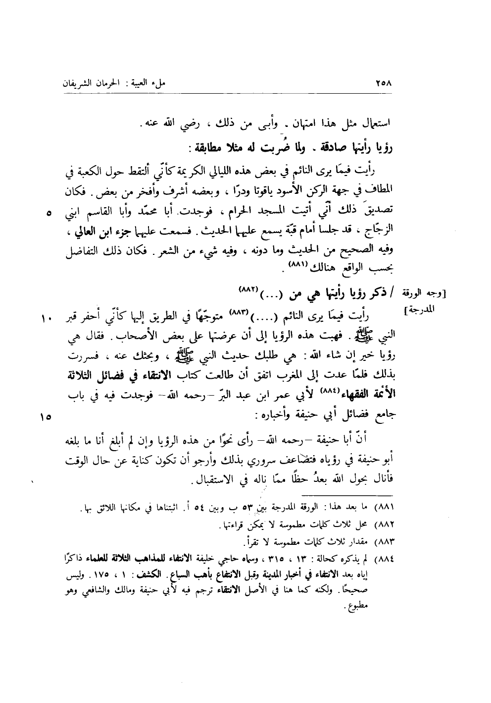 ذكر رؤيا رأيتها هي من 000 رأيت فيما يرى النائم 0000 متوجها في الطريق إليها كأني أحفر قبر النبي صَلَّى اللَّهُ عَلَيْهِ وَسَلَّمَ فهبت هذه الرؤيا إلى أن عرضتها على بعض الأصحاب، فقال هي رؤيا خير إن شاء الله: هي طلبك حديث النبي صَلَّى اللَّهُ عَلَيْهِ وَسَلَّمَ، وبحثك عنه، فسرت بذلك فلما عدت إلى المغرب اتفق أن طالعت كتاب الانتقاء في فضائل الثلاثة الأئمة الفقهاء، لأبي عمر بن عبد البر رَحِمَهُ اللَّهُ فوجدت فيه في باب جامع فضائل أبي حنيفة وأخباره.