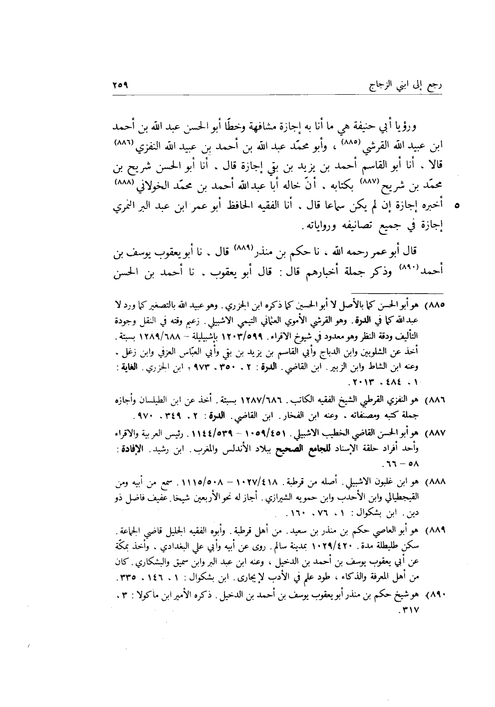 ورؤيا أبي حنيفة هي ما أنا به إجازة مشافهه وخطأ أَبُو الْحَسَنِ عبد الله بن أَحْمَدَ بْنِ عبيد الله القرشي وأبو محمد عبد الله بن أَحْمَدَ بْنِ عبيد الله النفزي قالا: أنا أَبُو الْقَاسِمِ أحمد بن يزيد بن بقي إجازة، قَالَ: أنا أَبُو الْحَسَنِ شريح بن مُحَمَّدِ بْنِ شريح، بكتابه، أن خاله أبا عبد الله أحمد بن مُحَمَّدٍ الخولاني.