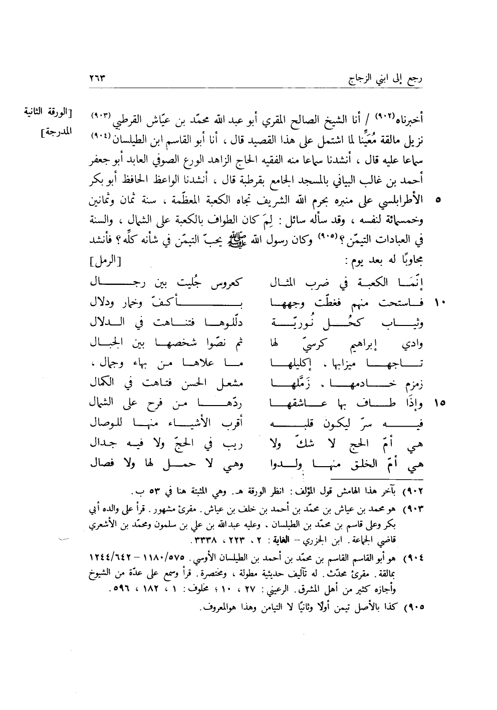 أخبرناه، أنا الشيخ الصالح المقري أَبُو عَبْدِ اللَّهِ محمد بن عياش القرطبي نزيل مالقة معينا لما اشتمل على هذا القصيد، قَالَ، أنا أبو القاسم ابن الطيلسان، سماعا عليه، قَالَ، أنشدنا سماعا منه الفقيه الحاج الزاهد الورع الصوفي العابد أبو جعفر أحمد بن غالب البياني بالمسجد الجامع بقرطبة، قَالَ، أنشدنا الواعظ الحافظ أبو بكر الأطرابلسي، على منبره بحرم الله الشريف تجاه الكعبة المعظمة، سنة ثمان وثمانين وخمس مائة لنفسه، وقد سأله سائل: لم كان الطواف بالكعبة على الشمال، والسنة في العبادات التيمن؟ وكان رسول الله صَلَّى اللَّهُ عَلَيْهِ وَسَلَّمَ يحب التيمن في شأنه كله؟ فأنشد مجاوبا له بعد يوم: