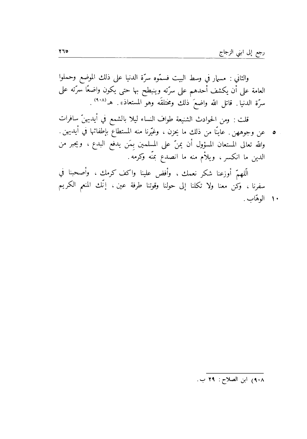 قلت: ومن الحوادث الشنيعة طواف النساء ليلا بالشمع في أيديهن سافرات عن وجوههن، عاينا من ذلك ما يحزن، وغيرنا منه المستطاع بإطفائها في أيديهن والله تعالى المستعان المسئول أن يمن على المسلمين بمن يدفع البدع، ويجبر من الدين ما انكسر، ويلأم منه ما انصدع بمنه وكرمه.