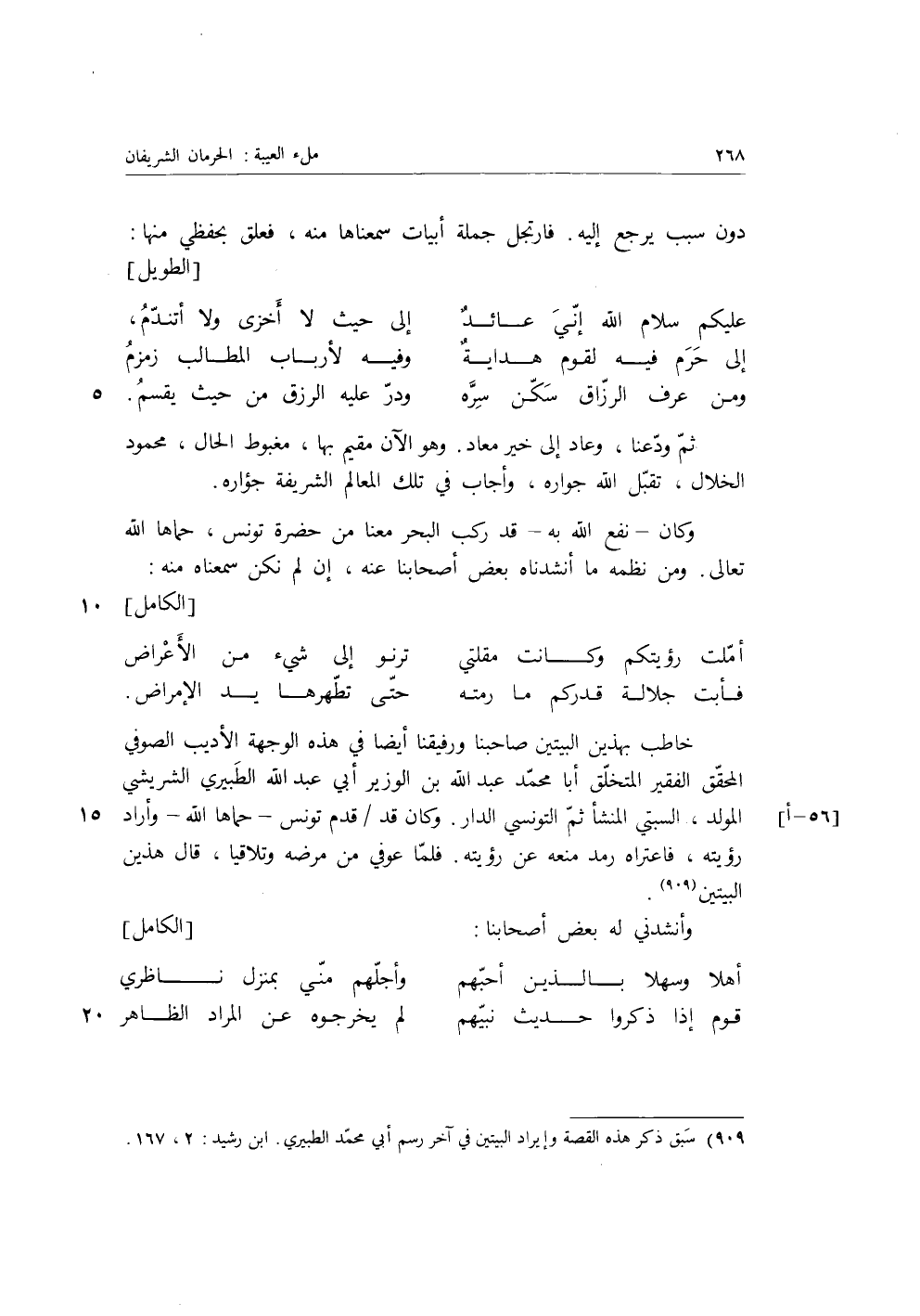 خاطب بهذين البيتين صاحبنا ورفيقنا أيضا في هذه الوجهة الأديب الصوفي المحقق الفقير المتخلق أبا محمد عبد الله بن الوزير أبي عبد الله الطبيري الشريشي المولد، السبتي المنشأ ثم التونسي الدار، وكان قد قدم تونس حماها الله، وأراد رؤيته، فاعتراه رمد منعه عن رؤيته، فلما عوفي من مرضه وتلاقيا، قَالَ هذين البيتين، وأنشدني له بعض أصحابنا: