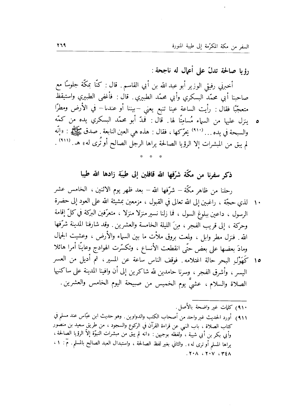 ذكر سفرنا من مكة شرفها الله قافلين إلى طيبة زادها الله طيبا رحلنا من ظاهر مكة شرفها الله بعد ظهر يوم الاثنين، الخامس عشر لذي حجة، راغبين إلى الله تعالى في القبول، مزمعين بمشيئة الله على العود إلى حضرة الرسول، داعين يبلوغ السول، فما زلنا نسير منزلا منزلا، متعرفين البركة في كل إقامة وحركة، إلى قريب الفجر من الليلة الخامسة والعشرين، وقد شارفنا المدينة شرفها الله، فنزل مطر وابل، ولمعت بروق ملأت ما بين السماء والأرض، وعشيت الجمال وماد بعضها على بعض حتى انقطعت الأنساع، وتكسرت الهوادج وعاينا أمرا هائلا كهول البحر حالة اغتلامه، فوقف الناس ساعة عن المسير، ثم أديل من العسر اليسر، وأشرق الفجر، وسرنا حامدين لله شاكرين إلى أن وافينا المدينة على ساكنيها الصلاة والسلام، عشي يوم الخميس من صبيحة اليوم الخامس والعشرين.