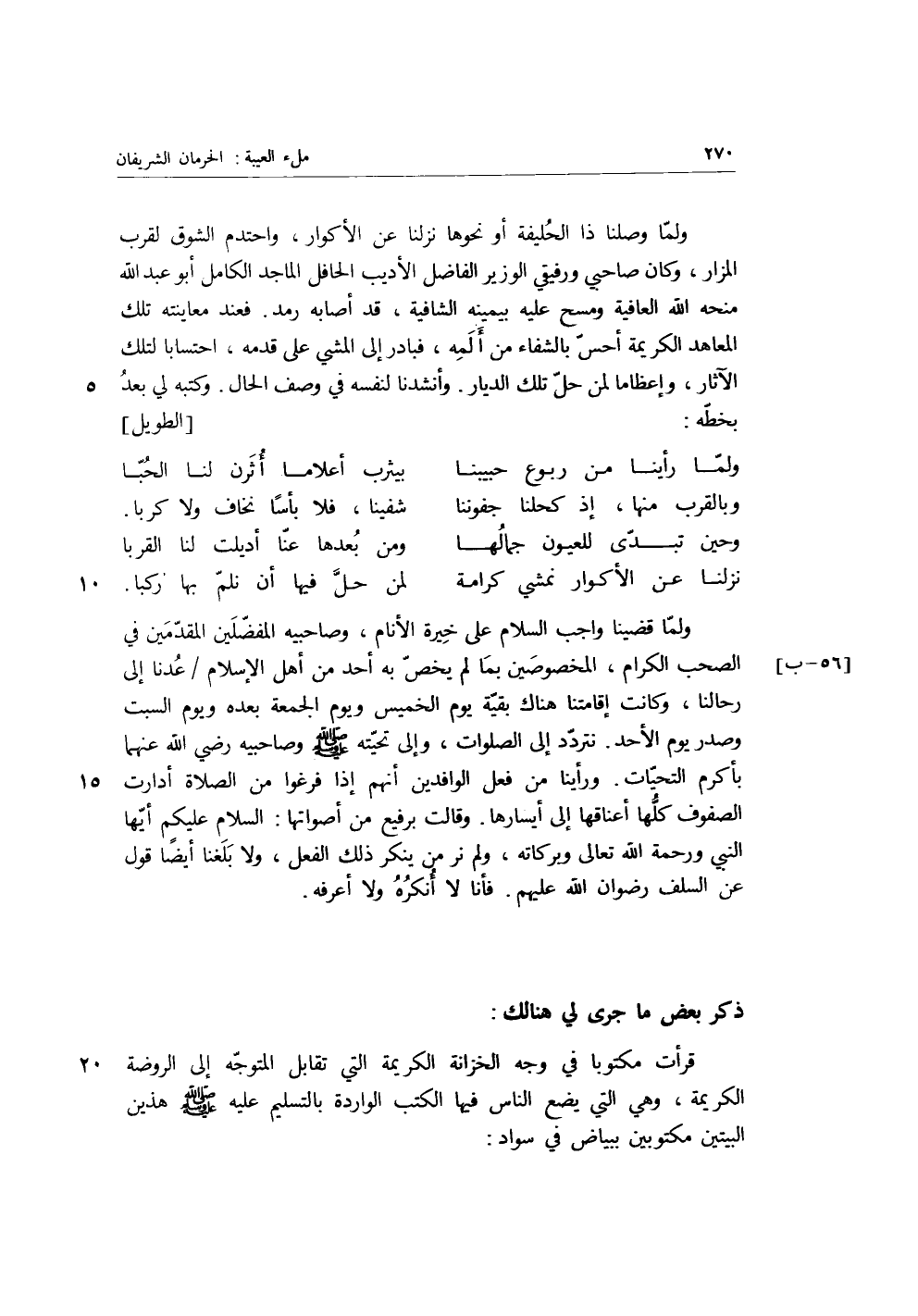 ولما وصلنا ذا الحليفة أو نحوها نزلنا من الأكوار، واحتدم الشوق لقرب المزار، وكان صاحبي ورفيقي الوزير الفاضل الأديب الحافل الماجد الكامل أَبُو عَبْدِ اللَّهِ منحه الله العافية ومسح عليه بيمينه الشافية، قد أصابه رمد، فعند معاينته تلك المعاهد الكريمة أحس بالشفاء من ألمه، فبادر إلى المشي على قدمه، احتسابا لتلك الآثار، وإعظاما لمن حل تلك الديار، وأنشدنا لنفسه في وصف الحال، وكتبه لي بعد بخطه:
