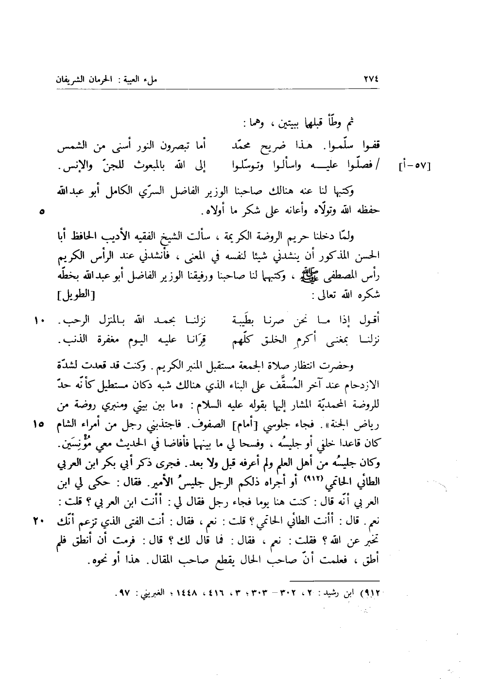 وكتبها لنا عنه هنالك صاحبنا الوزير الفاضل السري، الكامل أَبُو عَبْدِ اللَّهِ حفظه الله وتولاه وأعانه على شكر ما أولاه، ولما دخلنا حريم الروضة الكريمة، سألت الشيخ الفقيه الأديب الحافظ أبا الحسن المذكور أن ينشدني شيئا لنفسه في المعنى، فأنشدني عند الرأس الكريم رأس المصطفى صَلَّى اللَّهُ عَلَيْهِ وَسَلَّمَ وكتبهما لنا صاحبنا ورفيقنا الوزير الفاضل أَبُو عَبْدِ اللَّهِ بخطه شركه الله تعالى.