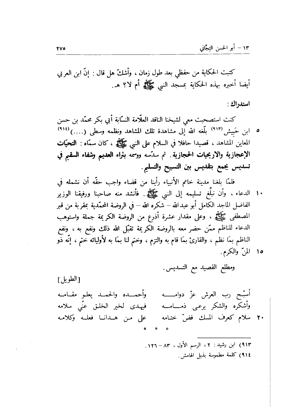 استدراك: كنت استصحبت معي لشيخنا الناقد العلامة النسابة أبي بكر محمد بن حسن بن حبيش، بلغه الله إلى مشاهدة تلك المشاهد ونظمه وسطى المعاين المشاهد قصيدا حافلا في السلام على النبي صَلَّى اللَّهُ عَلَيْهِ وَسَلَّمَ، كان سماه: التحيات الإعجازية والأريحيات الحجازية، ثم سدسه ووسمه بثراء العديم وشفاء السقيم في تسديس بجمع بتقديس بين التسبيح والتسليم.