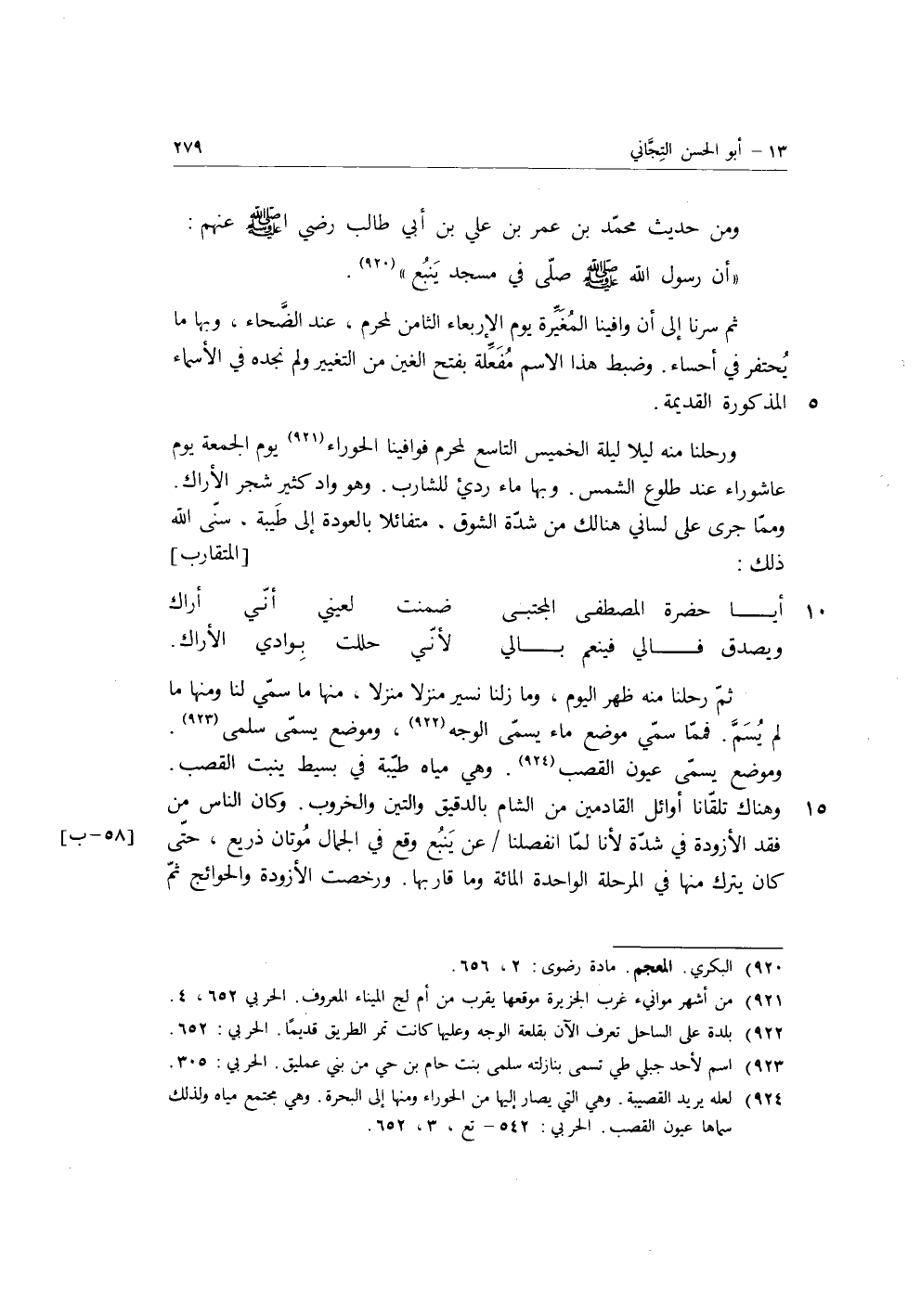 ورحلنا منه ليلا ليلة الخميس التاسع لمحرم فوافينا الحوراء يوم الجمعة يوم عاشوراء عند طلوع الشمس، وبها ماء رديء للشارب، وهو واد كثير شجر الأراك ومما جرى على لساني هنالك من شدة الشوق، متفائلا بالعودة إلى طيبة، سنى الله ذلك: