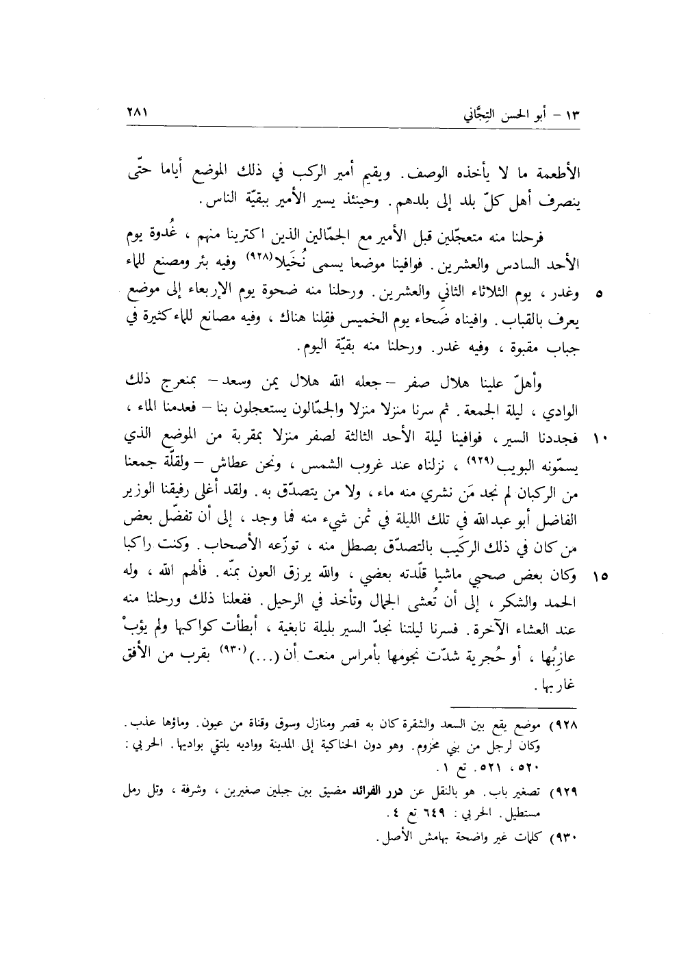 وأهل علينا هلال صفر، جعله الله هلال يمن وسعد، بمنعرج ذلك الوادي، ليلة الجمعة، ثم سرنا منزلا منزلا والجمالون يستعجلون بنا فعدمنا الماء، فجددنا السير، فوافينا ليلة الأحد الثالثة لصفر منزلا بمقربة من الموضع الذي يسمونه البويب، نزلناه عند غروب الشمس، ونحن عطاش، ولقلة جمعنا من الركبان لم نجد من نشري منه ماء، ولا من يتصدق به، ولقد أغلى رفيقنا الوزير الفاضل أَبُو عَبْدِ اللَّهِ في تلك الليلة في ثمن شيء منه فما وجد، إلى أن تفضل بعض من كان في ذلك الركيب بالتصدق بصطل منه، توزعه الأصحاب، وكنت راكبا وكان بعض صحبي ماشيا قلدته بعضي، والله يرزق العون بمنه، فألهم الله، وله الحمد والشكر، إلى أن تعشى الجمال وتأخذ في الرحيل، ففعلنا ذلك ورحلنا منه عند العشاء الآخرة، فسرنا ليلتنا نجد السير بليلة نابغية، أبطأت كواكبها ولم يؤب عازبها، أو حجرية شدت نجومها بأمراس منعت أن. . . . . . . بقرب من الأفق غاربها.