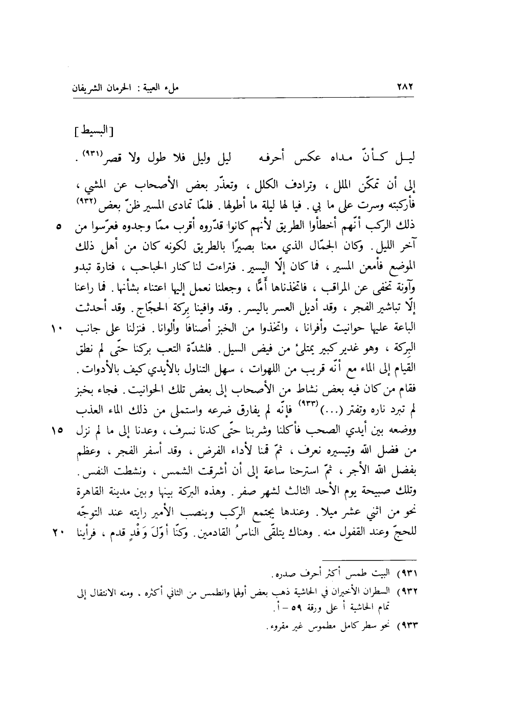ليل كأن مداه عكس أحرفه ليل وليل فلا طول ولا قصر إلى أن تمكن الملل، وترادف الكلل، وتعذر بعض الأصحاب عن المشي، فأركبته وسرت على ما بي، فيا لها ليلة ما أطولها، فلما تمادى المسير ظن بعض ذلك الركب أنهم أخطأوا الطريق لأنهم كانوا قدروه أقرب مما وجدوه فعرسوا من آخر الليل، وكان الجمال الذي معنا بصيرا بالطريق لكونه كان من أهل ذلك الموضع فأمعن المسير، فما كان إلا اليسير، فتراءت لنا كنار الحباحب، فتارة تبدو وآونة تخفى عن المراقب، فاتخذناها أما، وجعلنا نعمل إليها اعتناء بشأنها، فما راعنا إلا تباشير الفجر، وقد أديل العسر باليسر، وقد وافينا بركة الحجاج، وقد أحدثت الباعة عليها حوانيت وأفرانا، واتخذوا من الخبز أصنافا وألوانا، فنزلنا على جانب البركة، وهو غدير كبير يمتلئ من فيض السيل فلشدة التعب بركنا حتى لم نطق القيام إلى الماء مع أنه قريب من اللهوات، سهل التناول بالأيدي كيف بالأدوات، فقام من كان فيه بعض نشاط من الأصحاب إلى بعض تلك الحوانيت، فجاء بخبز لم تبرد ناره وتفتر. . . . . . . فإنه لم يفارق ضرعه واستملى من ذلك الماء العذب ووضعه بين أيدي الصحب فأكلنا وشربنا حتى كدنا نسرف، وعدنا إلى ما لم نزل من فضل الله وتيسيره نعرف، ثم قمنا لأداء الفرض، وقد أسفر الفجر، وعظم بفضل الله الأجر، ثم استرحنا ساعة إلى أن أشرقت الشمس، ونشطت النفس، وتلك صبيحة يوم الأحد الثالث لشهر صفر، وهذه البركة بينها وبين مدينة القاهرة نحو من اثني عشر ميلا، وعندها يجتمع الركب وينصب الأمير رايته عند التوجه للحج، وعند القفول منه، وهناك يتلقى الناس القادمين، وكنا أول وفد قدم فرأينا
