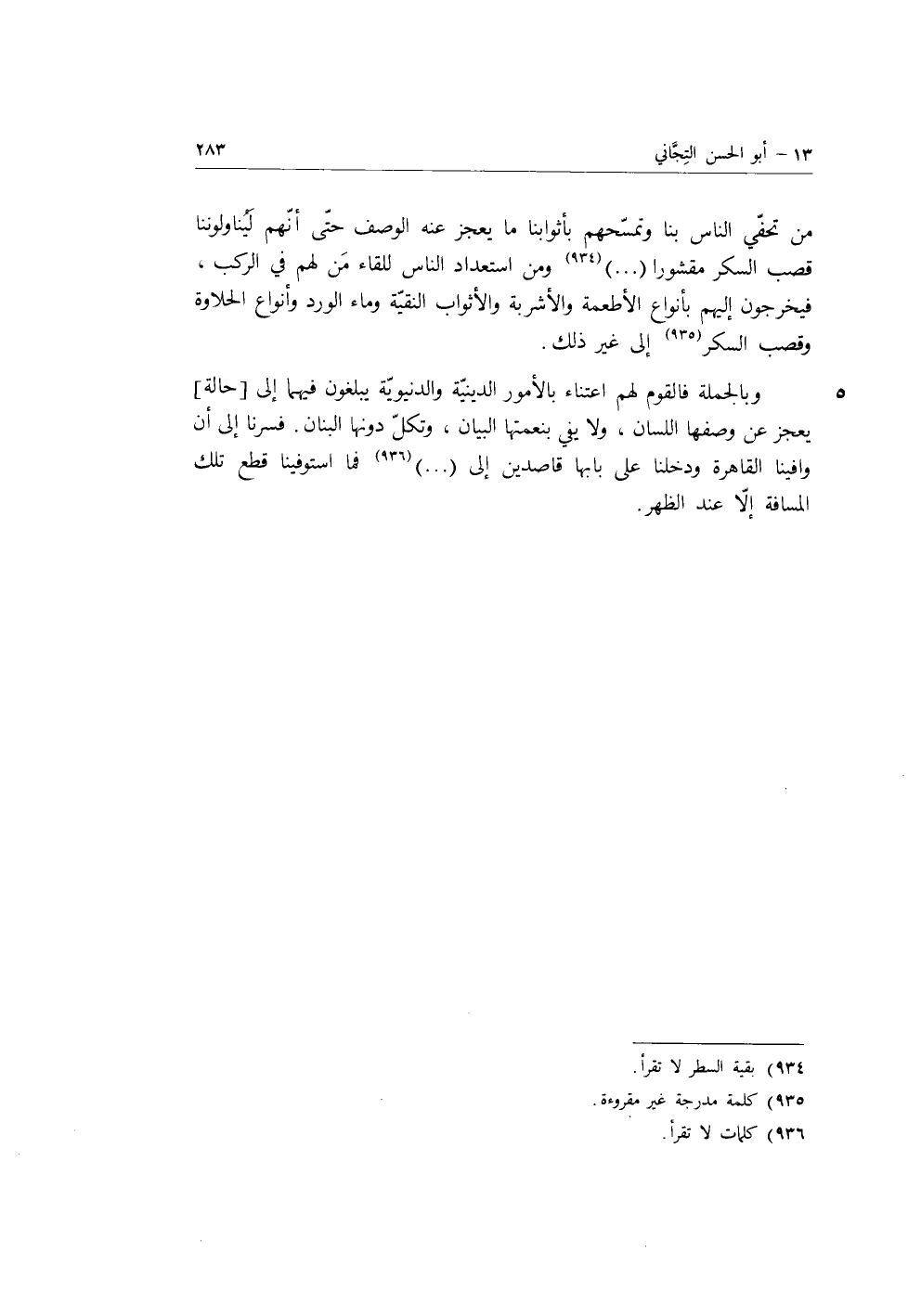 وبالجملة فالقوم لهم اعتناء بالأمور الدينية والدنيوية يبلغون فيهما إلى حالة يعجز عن وصفها اللسان، ولا يفي بنعمتها البيان، وتكل دونها البنان، فسرنا إلى أن وافينا القاهرة، ودخلنا على بابها قاصدين إلى. . . . . . . فما استوفينا قطع تلك المسافة إلى عند الظهر.