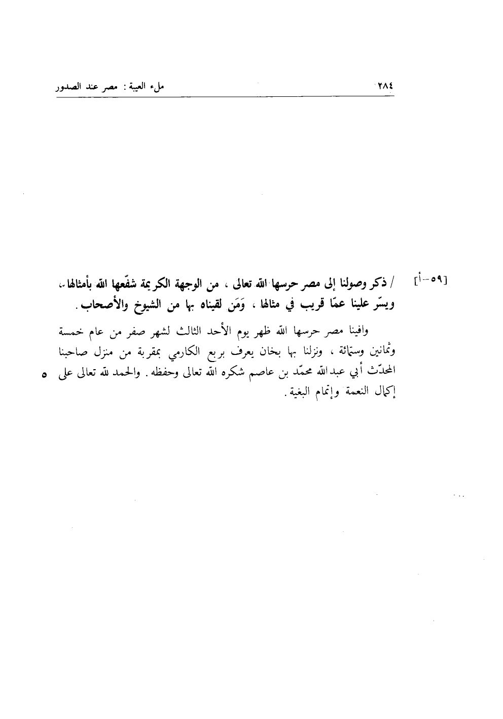 وافينا مصر حرسها الله ظهر يوم الأحد الثالث لشهر صفر من عام خمسة وثمانين وست مائة، ونزلنا بها بخان يعرف بربع الكارمي بمقربة من منزل صاحبنا المحدث أبي عبد الله محمد بن عاصم شكره الله تعالى وحفظه، والحمد لله تعالى على إكمال النعمة وإتمام البغية.