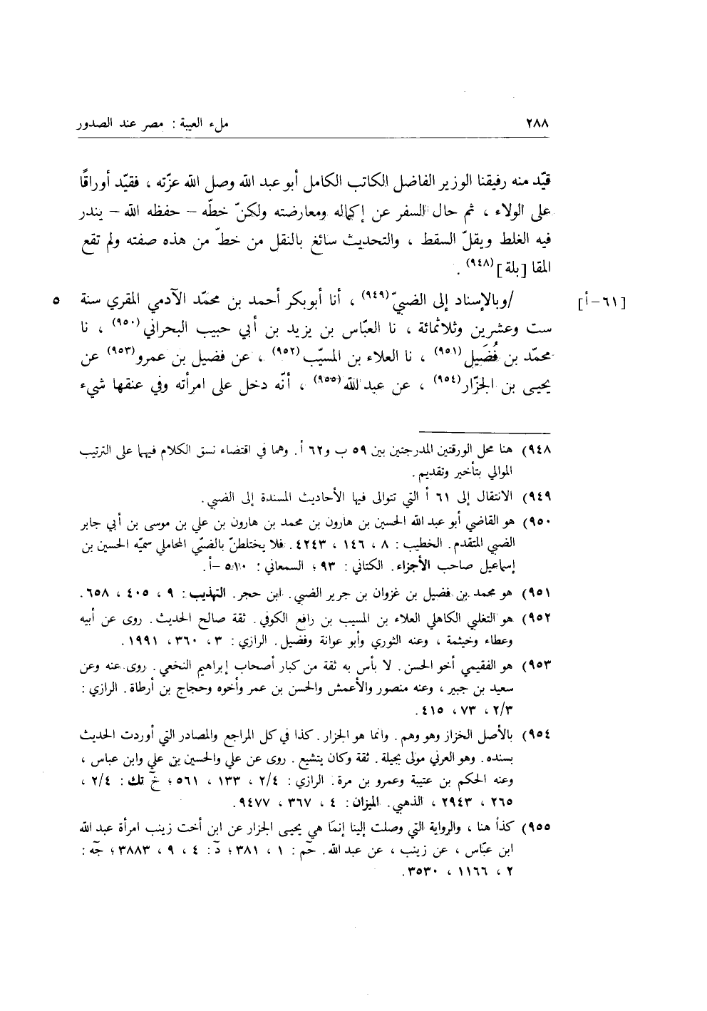 وَبِالإِسْنَادِ إِلَى الضَّبِّيِّ، أنا أَبُو بَكْرٍ أَحْمَدُ بْنُ مُحَمَّدٍ الآدَمِيُّ الْمُقْرِي سَنَةَ سِتٍّ وَعِشْرِينَ وَثَلاثِ مِائَةٍ، نا الْعَبَّاسُ بْنُ يَزِيدَ بْنِ أَبِي حَبِيبٍ الْبَحْرَانِيُّ، نا مُحَمَّدُ بْنُ فُضَيْلٍ، نا الْعَلاءُ بْنُ الْمُسَيَّبِ، عَنْ فُضَيْلِ بْنِ عَمْرٍو، عَنْ يَحْيَى بْنِ الْجَزَّارِ، عَنْ عَبْد اللَّهِ، أَنَّهُ دَخَلَ عَلَى امْرَأَتِهِ وَفِي عُنُقِهَا شَيْءٌ