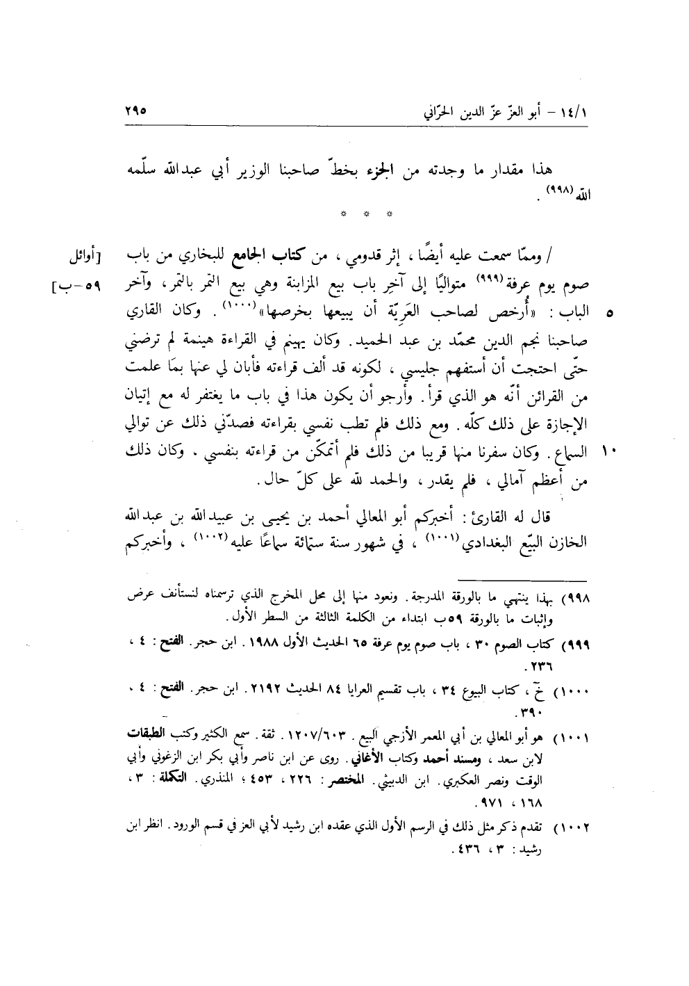 ومما سمعت عليه أيضا، إثر قدومي، من كتاب الجامع للبخاري من باب صوم يوم عرفة متواليا إلى آخر باب بيع المزابنة وهي بيع التمر بالتمر، وآخر الباب: «أرخص لصاحب العرية أن يبيعها بخرصها» ، وكان القري صاحبنا نجم الدين محمد بن عبد الحميد، وكان يهينم في القراءة هينمة لم ترضني حتى احتجت أن أستفهم جليسي، لكونه قد ألف قراءته فأبان لي عنها بما علمت من القرائن أنه هو الذي قرأ، وأرجو أن يكون في هذا باب ما يغتفر له مع إتيان الإجازة على ذلك كله ومع ذلك فلم تطب نفس بقراءته فصدني ذلك على توالى السماع، وكان سفرنا منها قريبا من ذلك فلم أتمكن من قراءته بنفسي، وكان ذلك من أعظم آمالي، فلم يقدر، والحمد الله على كل حال.